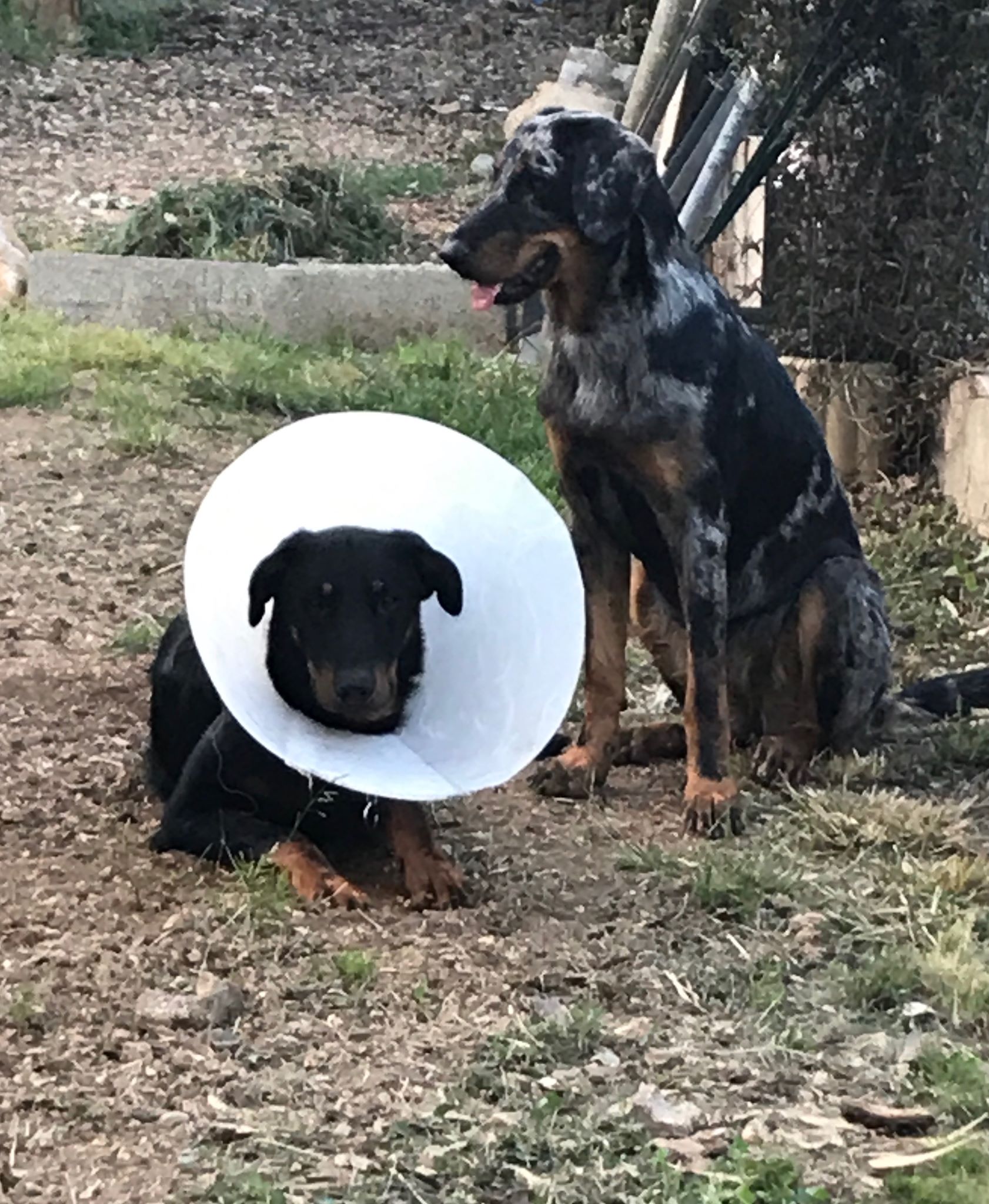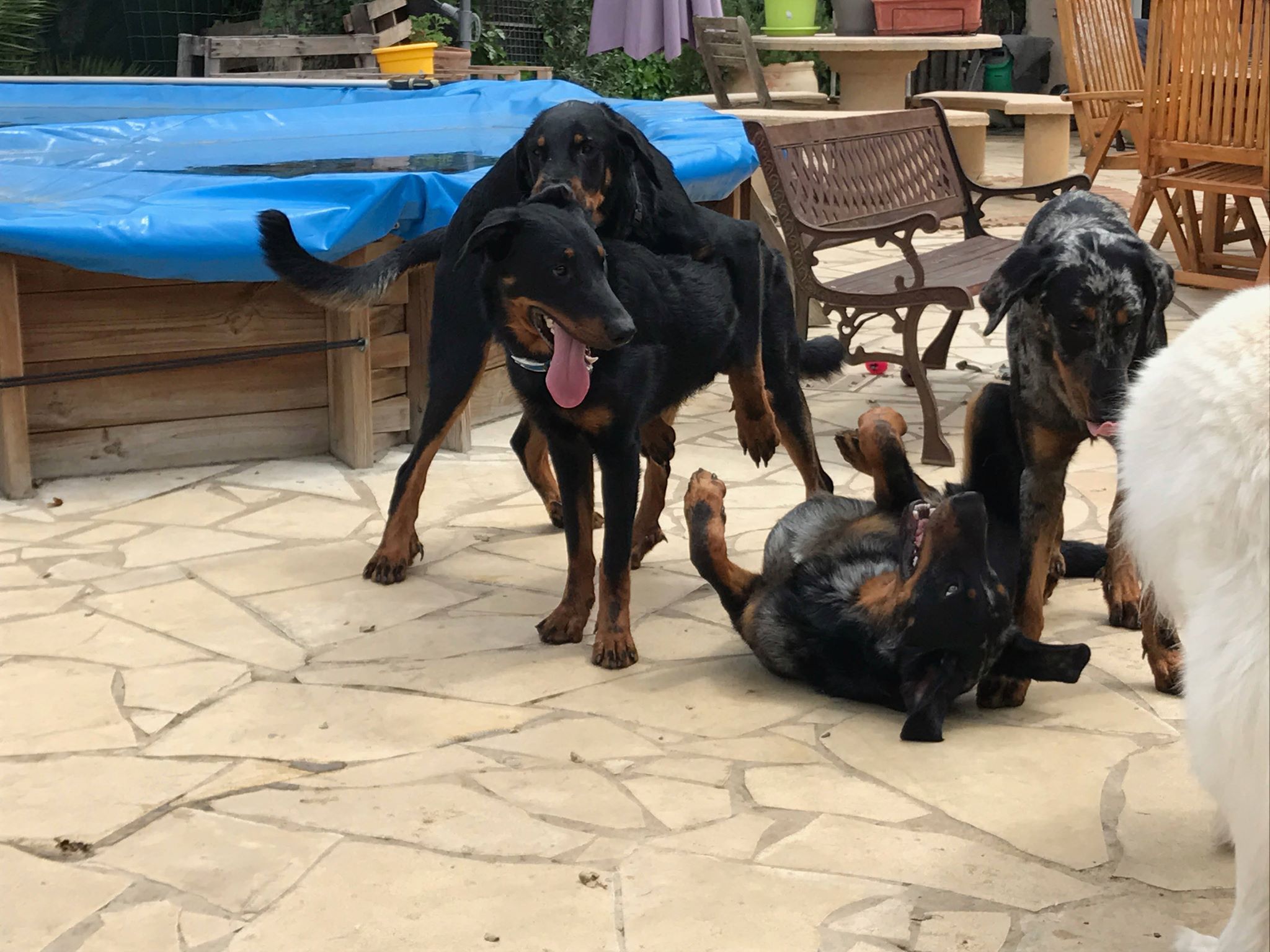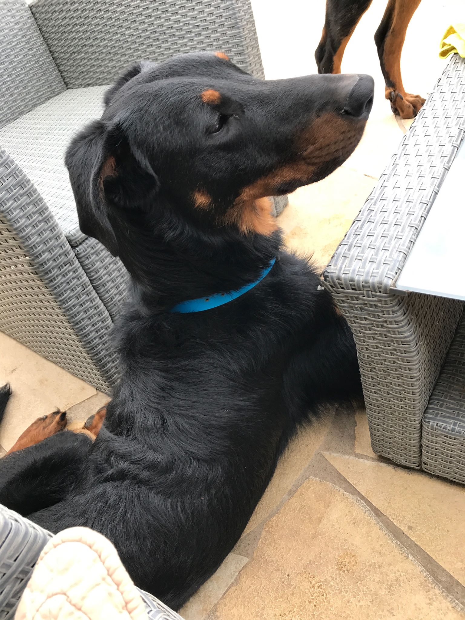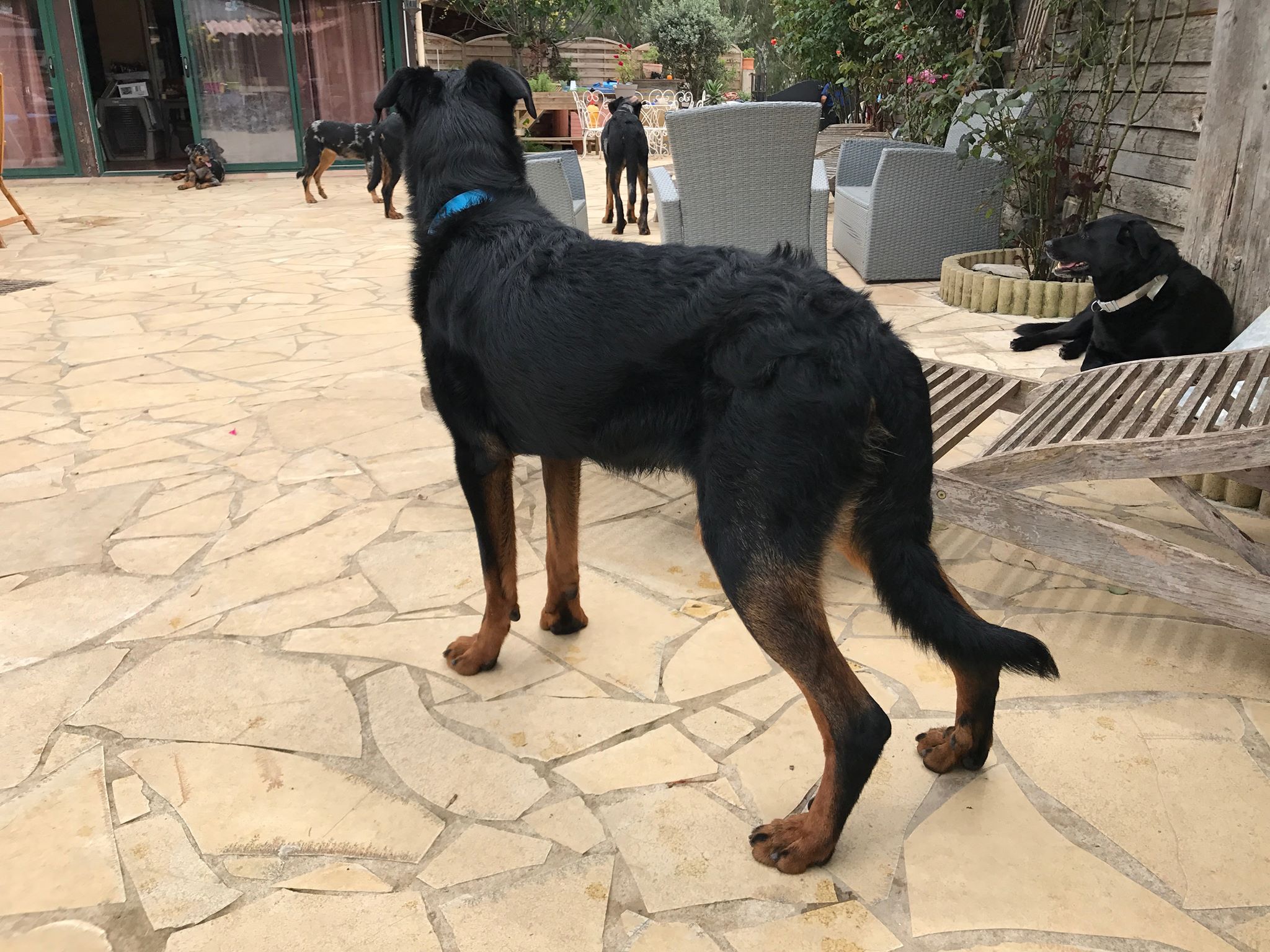 NEROS est un chien de type beauceron, non lof, noir et feu. Mâle castré né le 9/6/17, vacciné et pucé 250269606768932. Traité pour les puces, vermifuge.