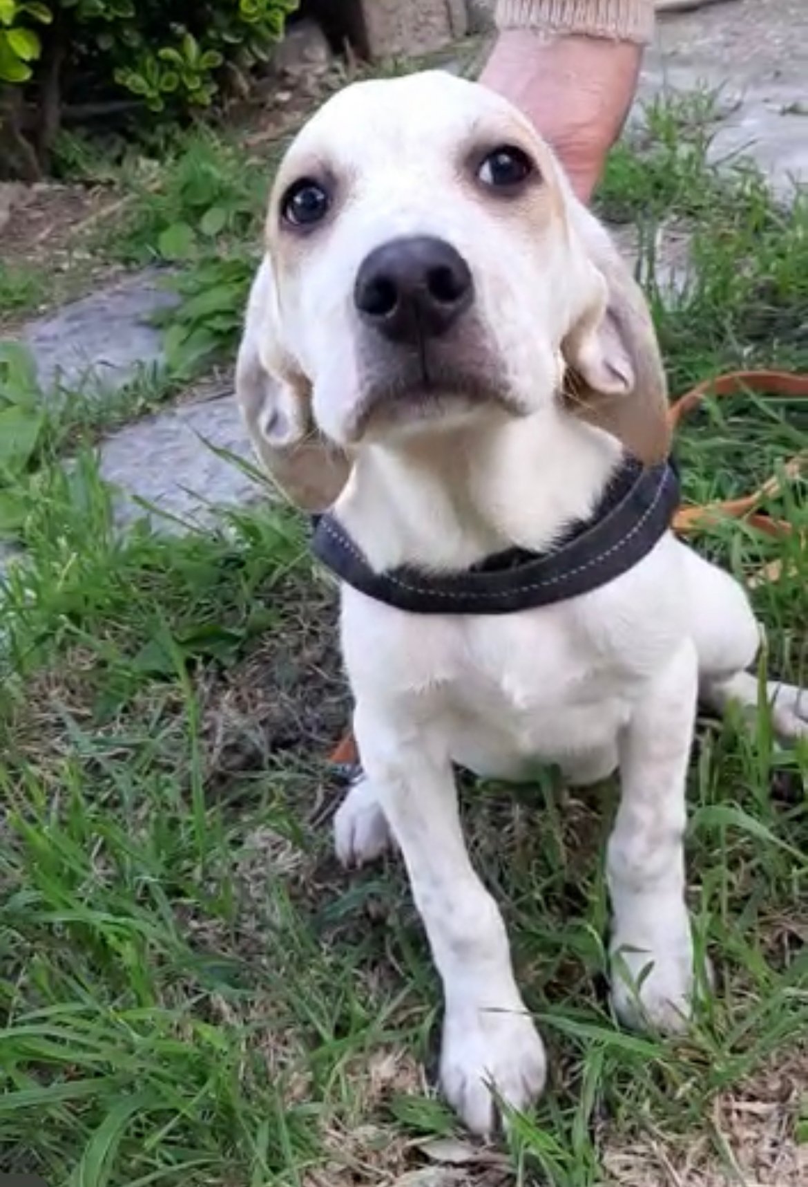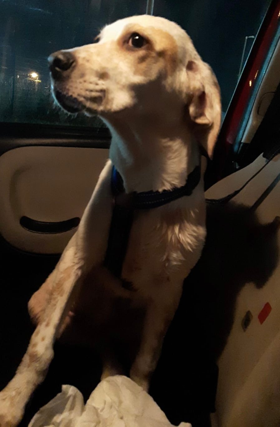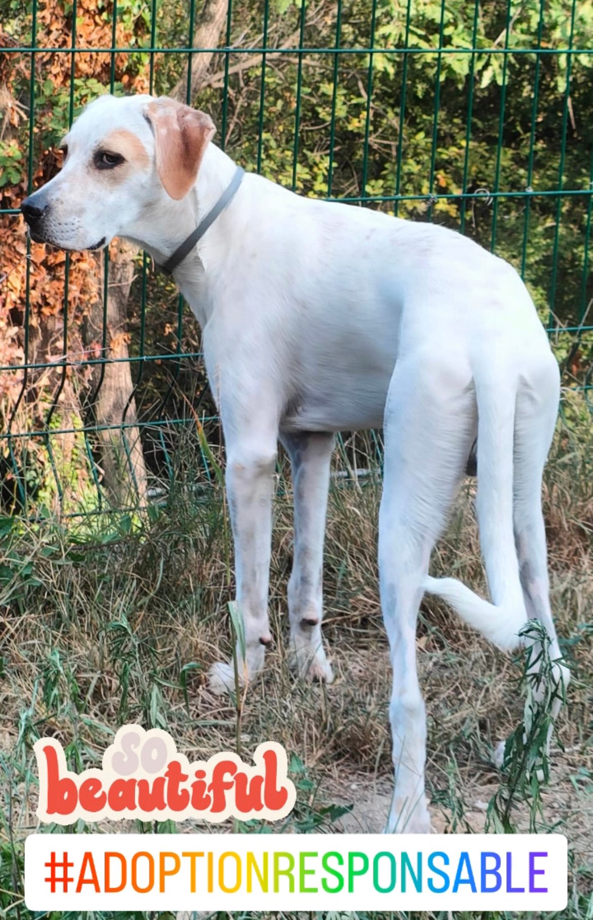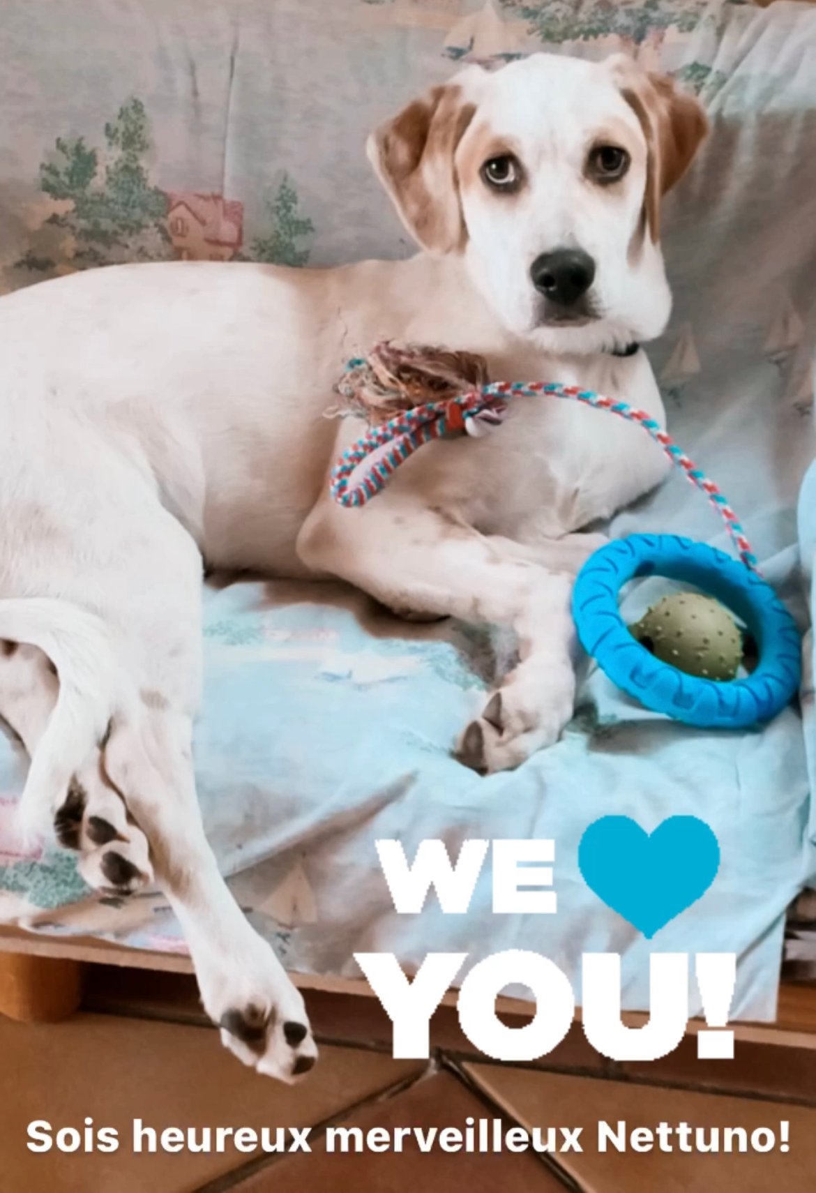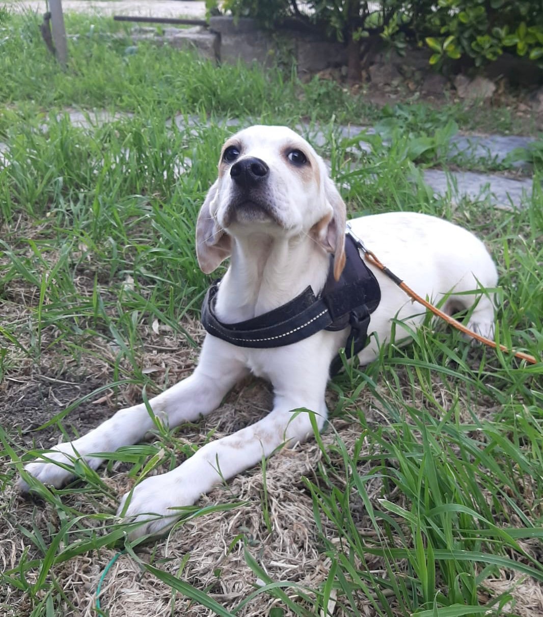 NETTUNO est un chiot de type croisé Setter Anglais (sa maman), le père est inconnu mais il pourrait s’agir d’un chien de berger. Il n’est pas LOF et il est de couleur blanc et beige.