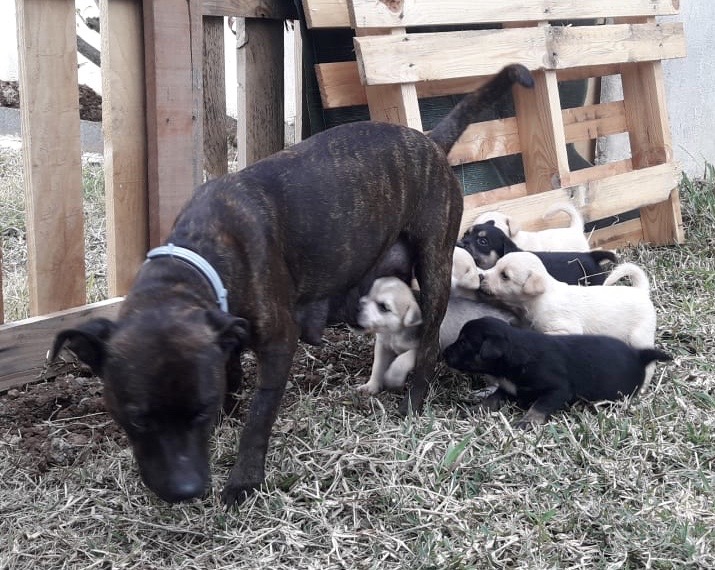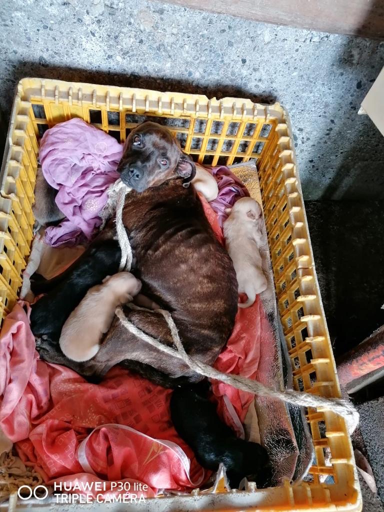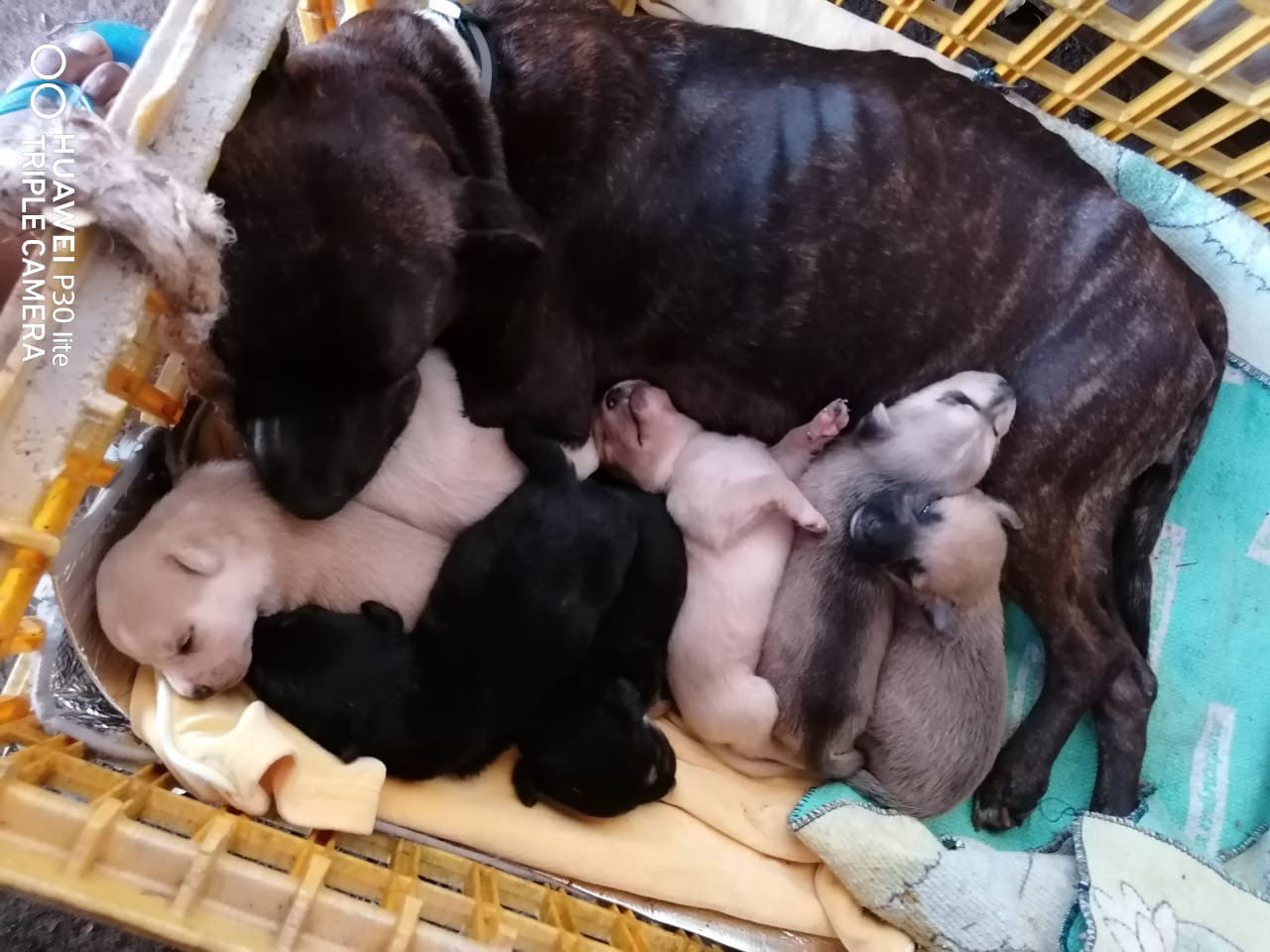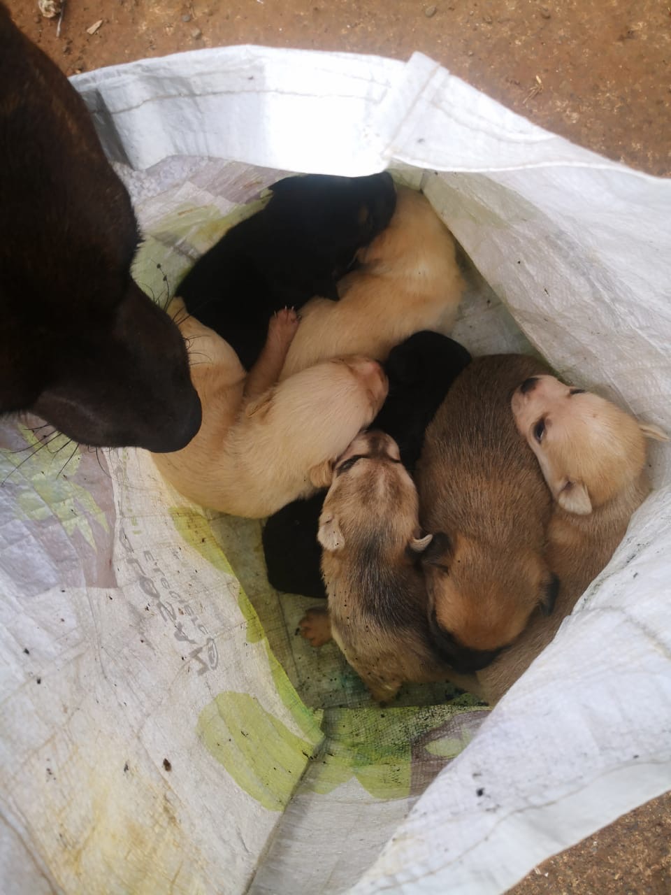 Une chienne squelettique a été retrouvée sur la route, dans un état lamentable, avec une portée de 7 chiots de 2 semaines.