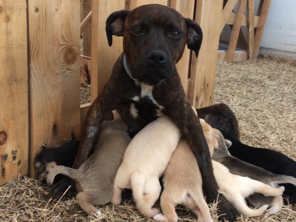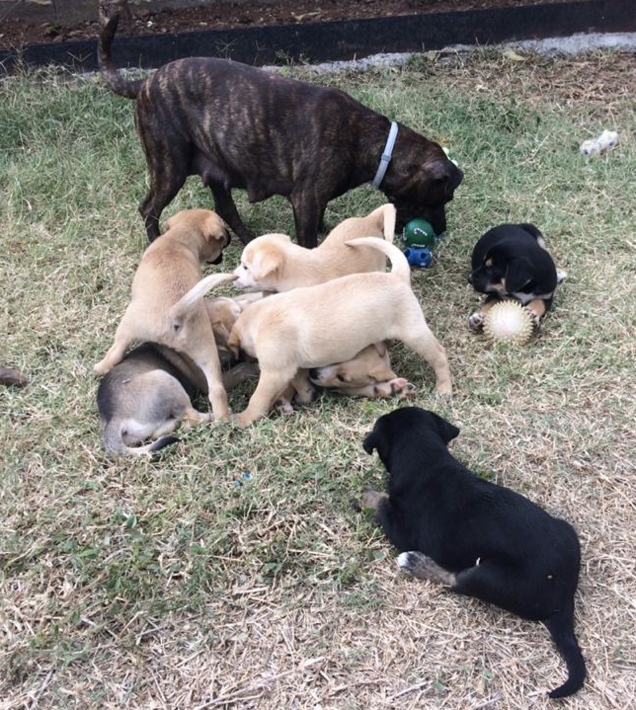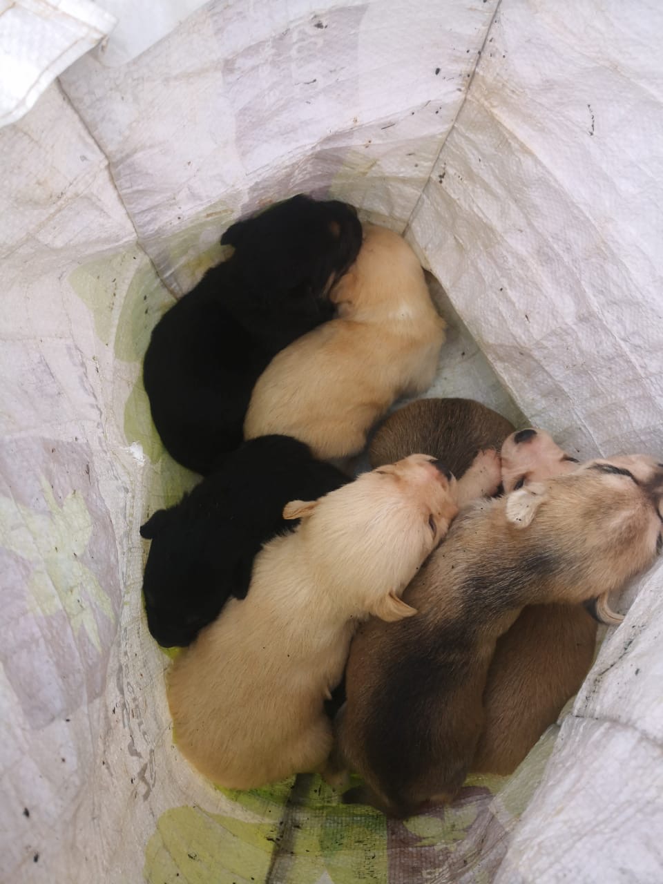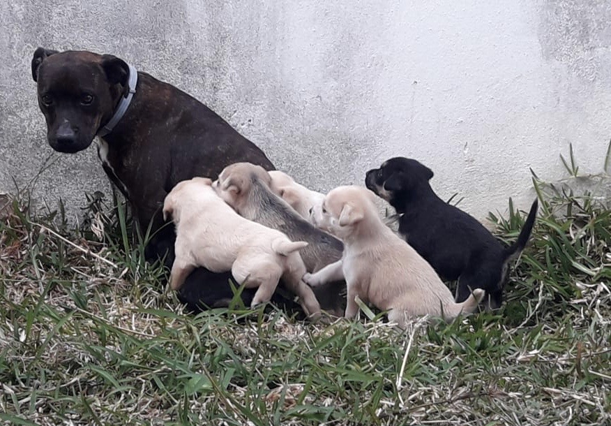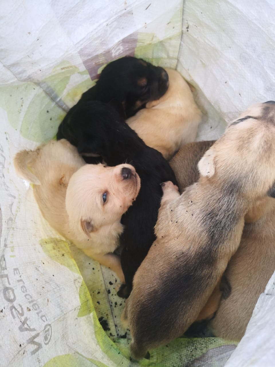 Une chienne squelettique a été retrouvée sur la route, dans un état lamentable, avec une portée de 7 chiots de 2 semaines.