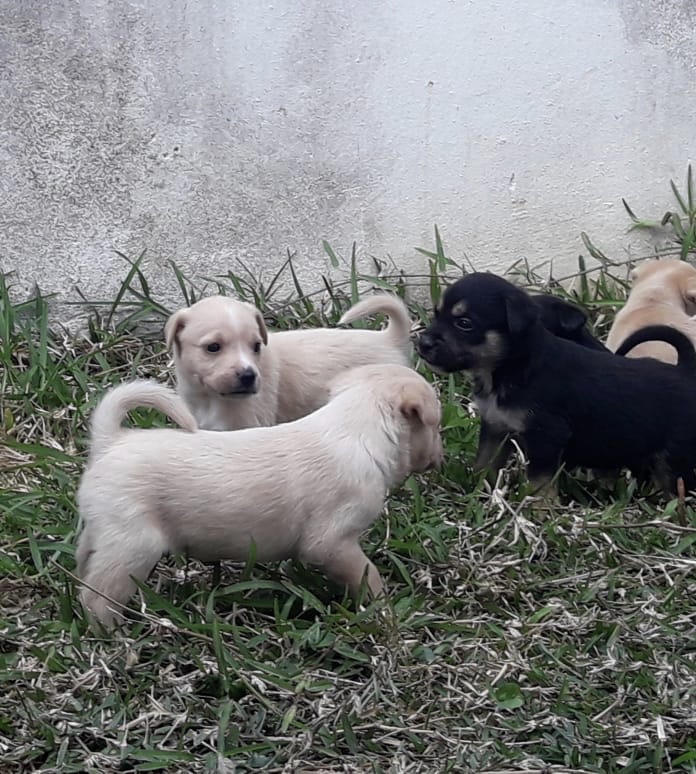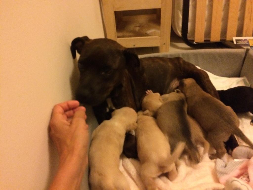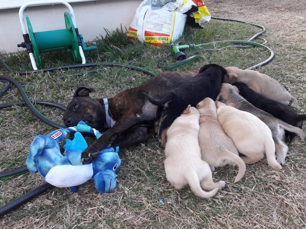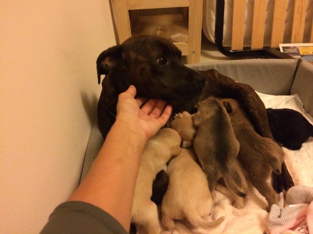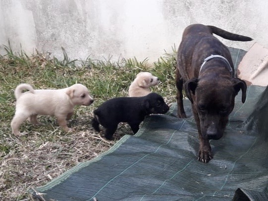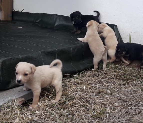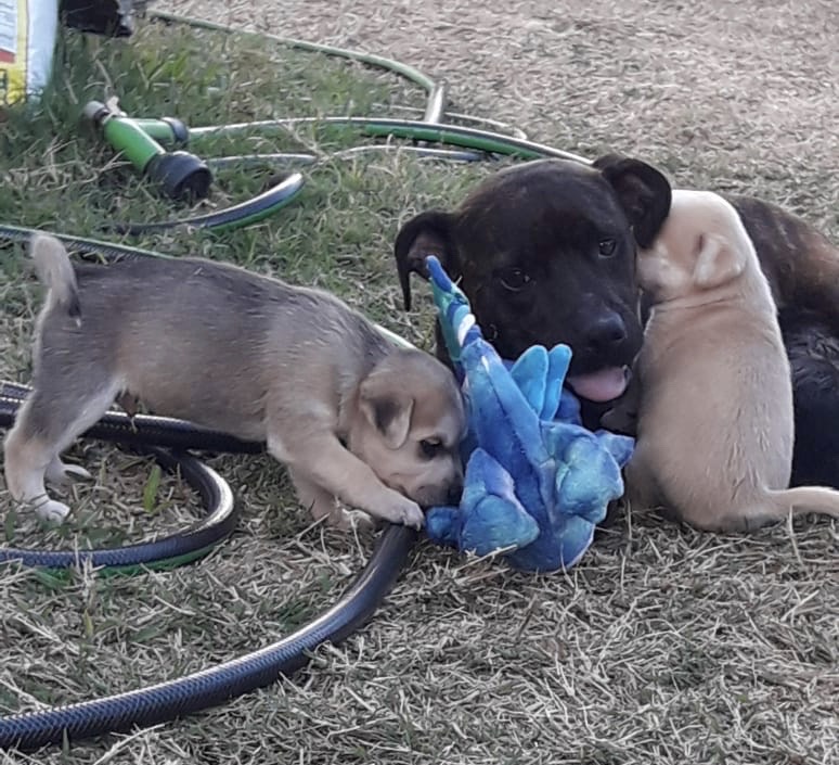 Une chienne squelettique a été retrouvée sur la route, dans un état lamentable, avec une portée de 7 chiots de 2 semaines.