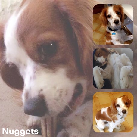 NUGGETS est un chien de type croisé Cavalier King Charles et Epagneul, couleur blanc et fauve. C’est un jeune mâle castré de 8 mois, né le 1/5/17, vacciné et pucé 250269811377744.