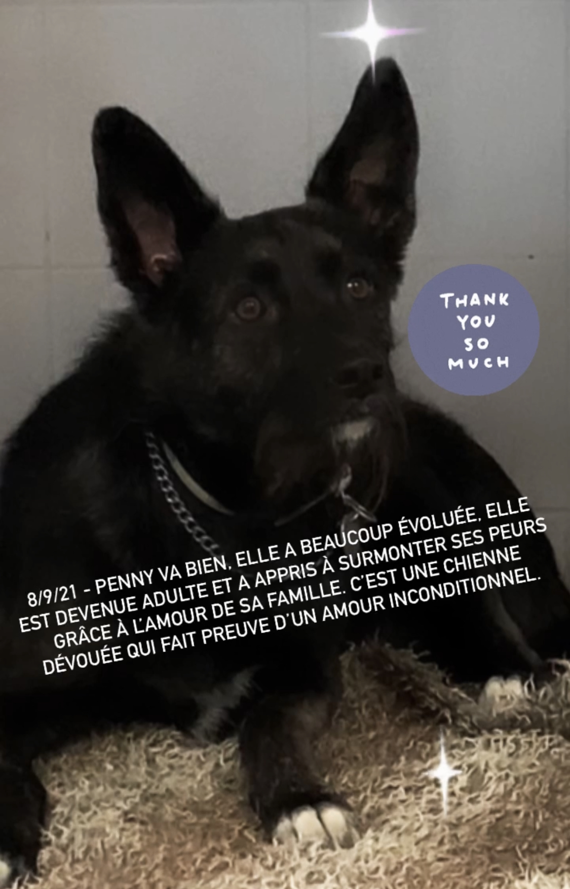 Pour elle nous souhaitons une famille investie, qui travaillera son éducation, socialisation et remise en confiance, avec amour, douceur et dans le positif uniquement.