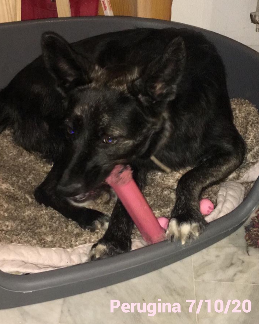 PERUGINA est originaire du Sud de l’Italie, près de Naples, et a mal commencé sa vie. Trouvée sur la route, renversée par une voiture, elle a eu une fracture du bassin et de la queue. Les fractures sont à présent ressoudées, et la petite n’a aucun problème de locomotion.