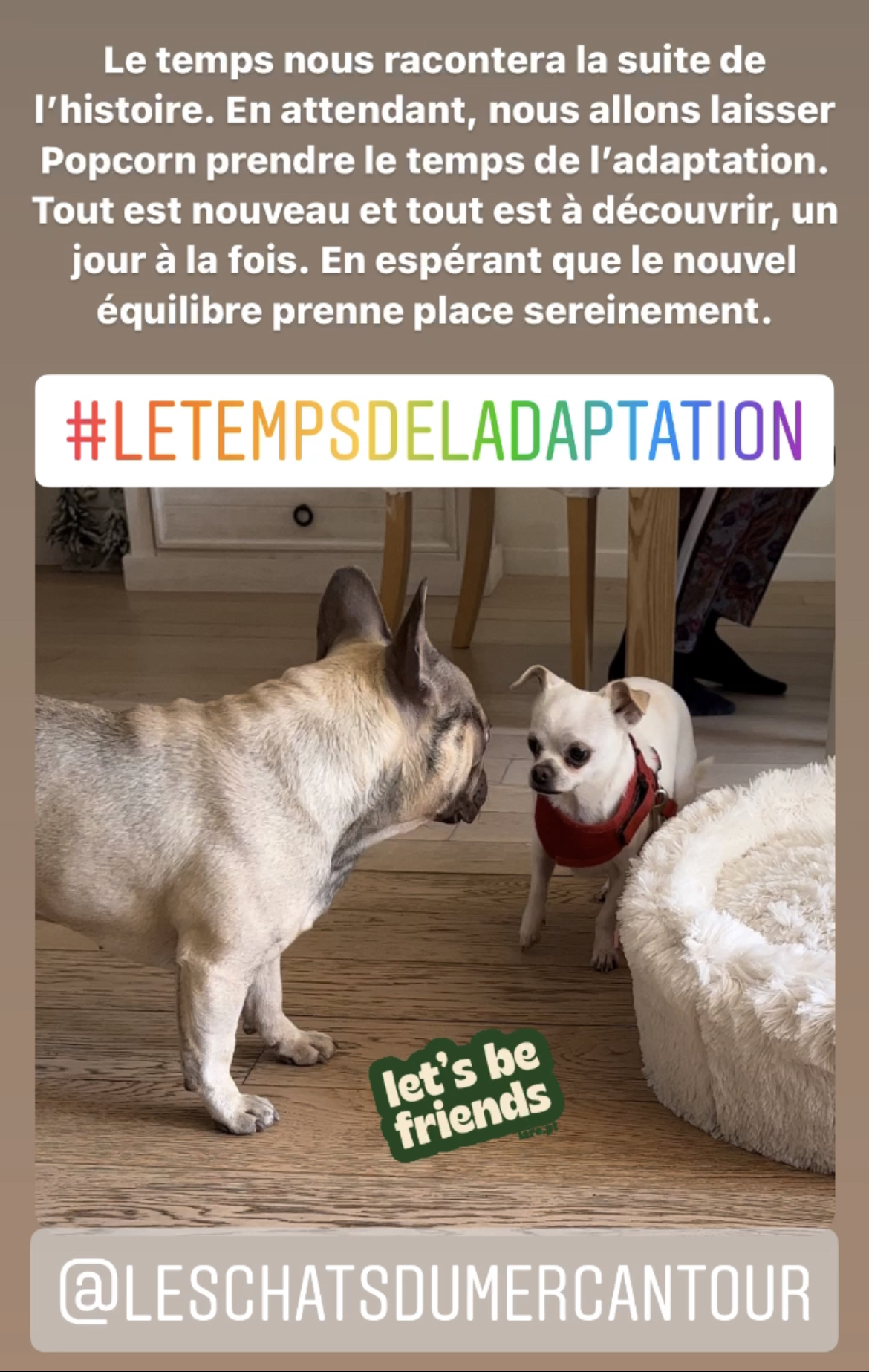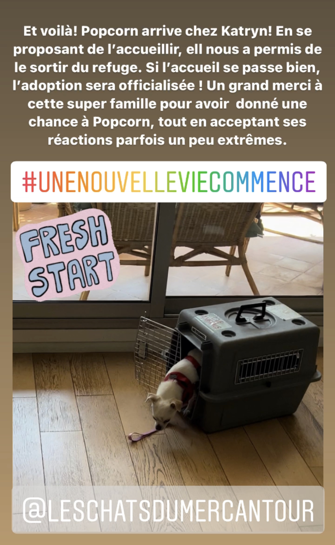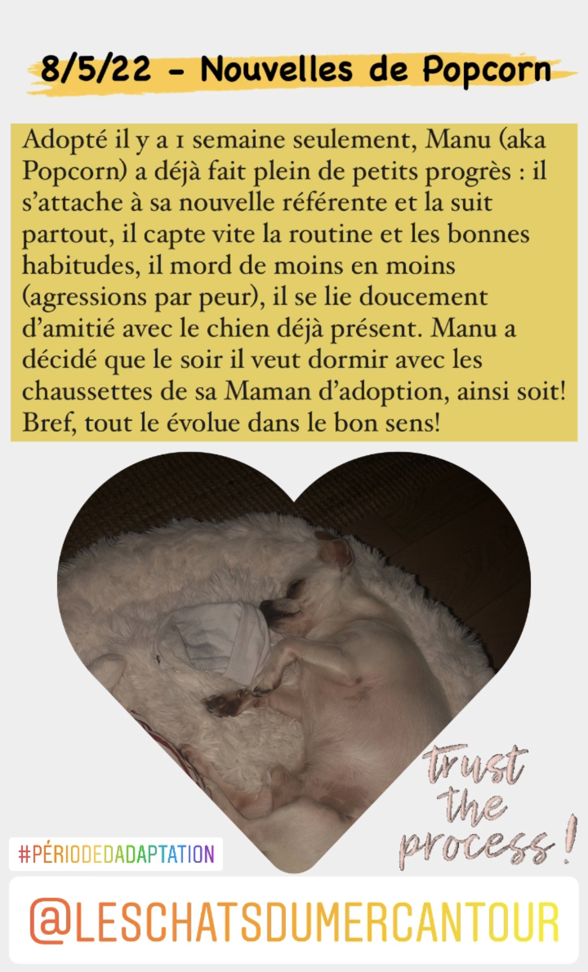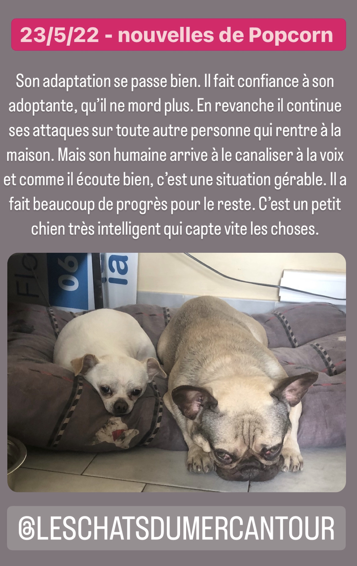 L’adoptant devra être une personne disponible et capable de comprendre/gérer le caractère réactif de Popcorn.