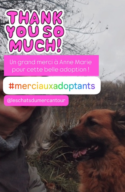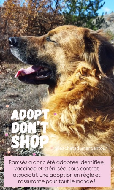 NB : merci de mûrement réfléchir à l’engagement moral et financier qu’une adoption représente (santé, factures vétérinaires, entretien, alimentation environ 1000 euros par an, absences, vacances ou autres = pension, accessoires quotidiens, éducation, etc.). Merci aussi de bien vous renseigner au préalable sur les caractéristiques de la race concernée. Un chien vit en moyenne 15 ans. C’est un être sensible avec tout ce que cela implique, ce n’est pas un objet ni un être qui agit sur commande.