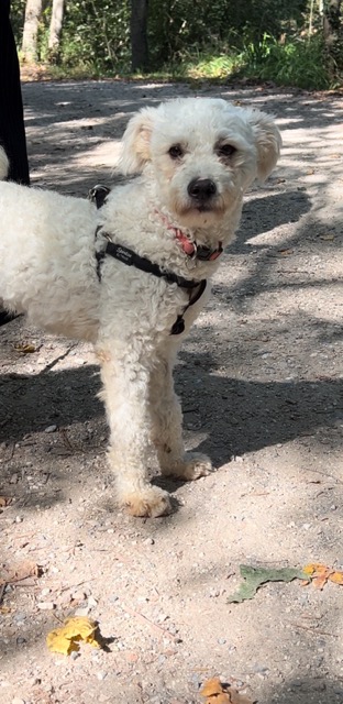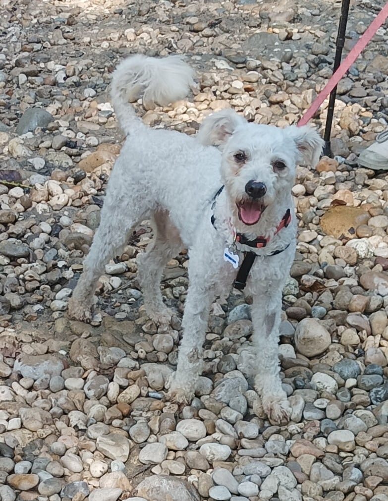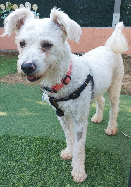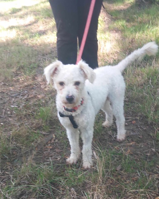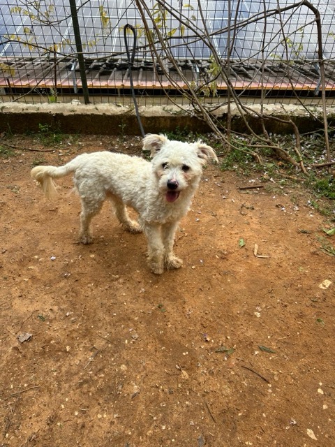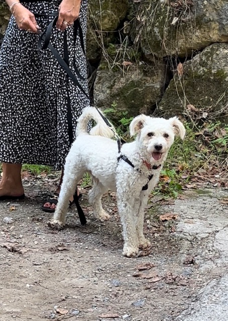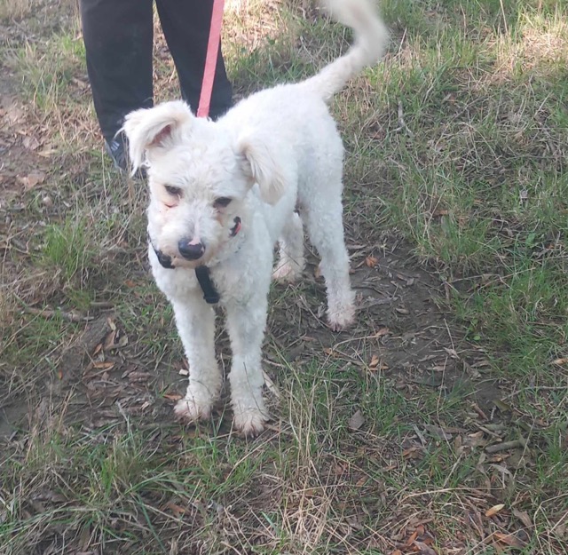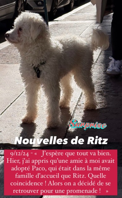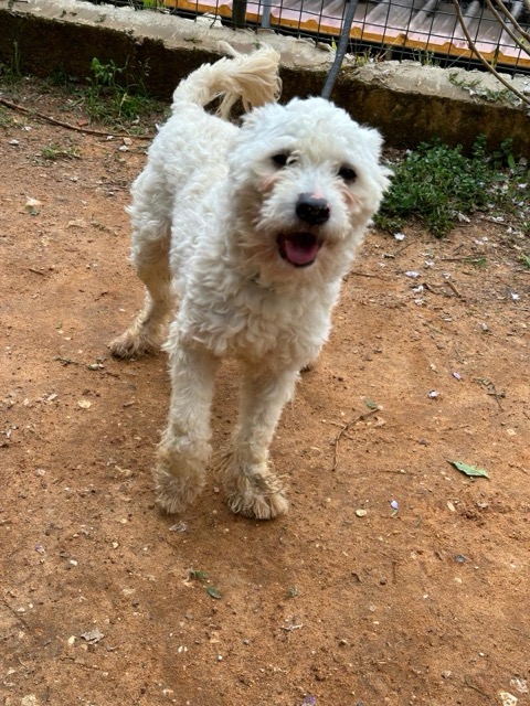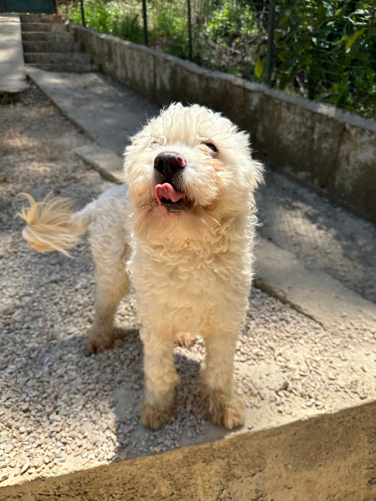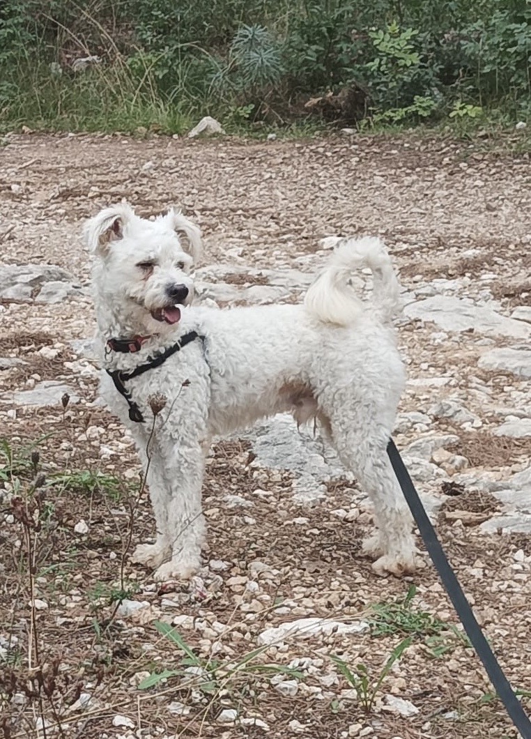 RITZ est un chien de type croisé bichon / caniche, non lof, couleur blanc au poil frisé.