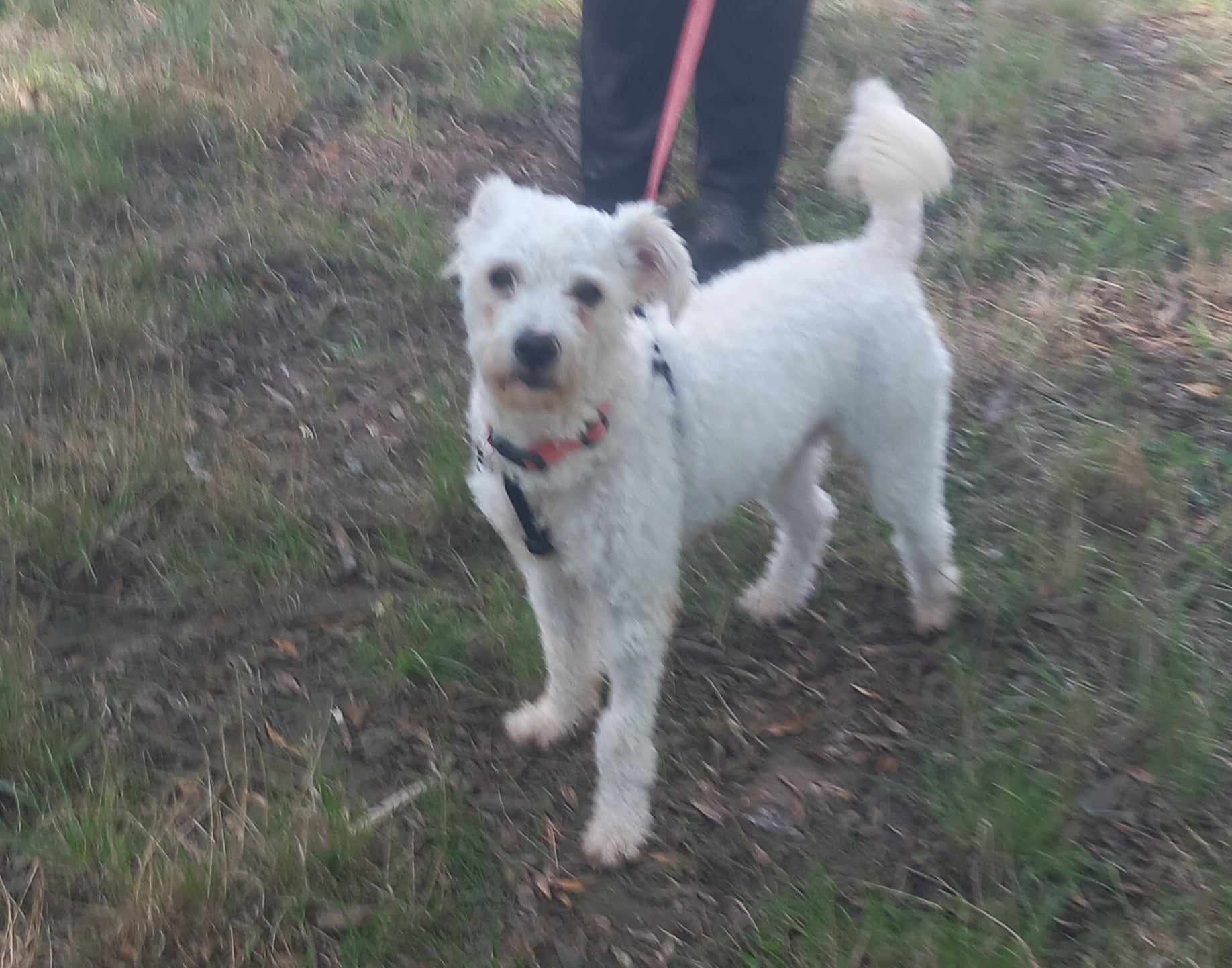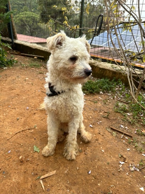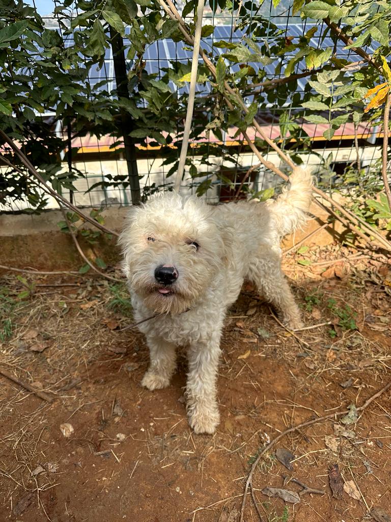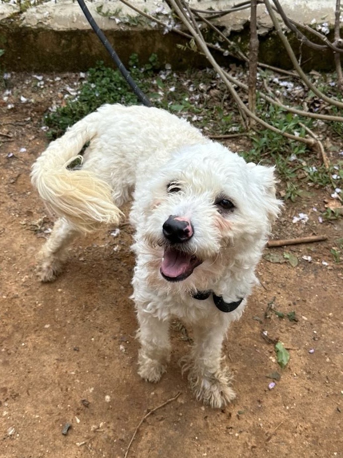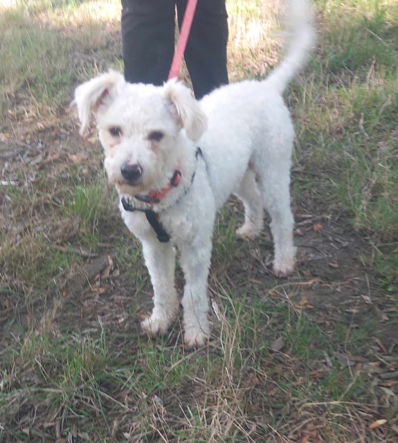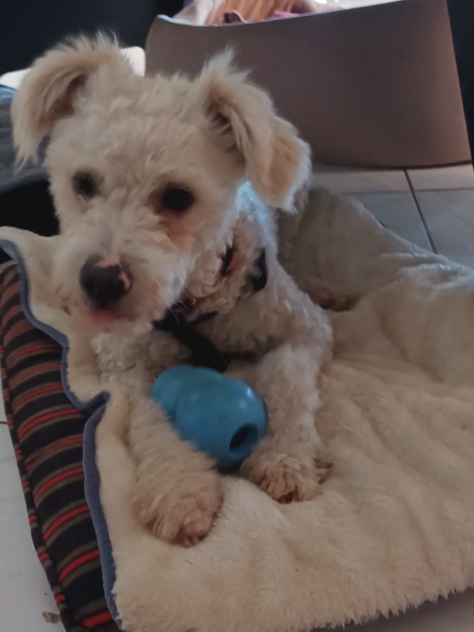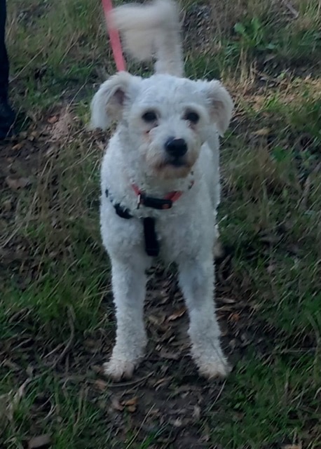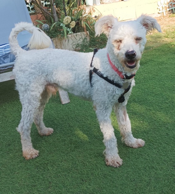 RITZ est un chien de type croisé bichon / caniche, non lof, couleur blanc au poil frisé.