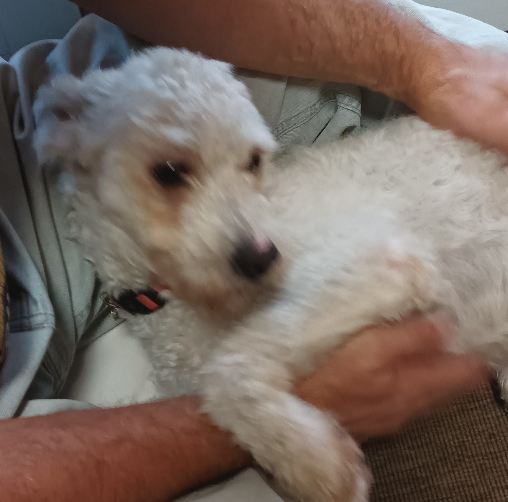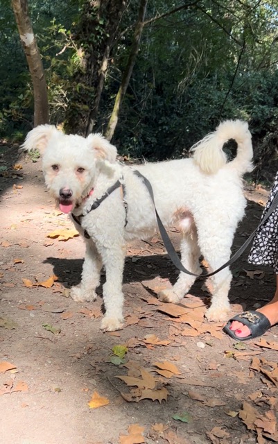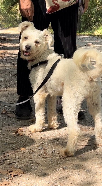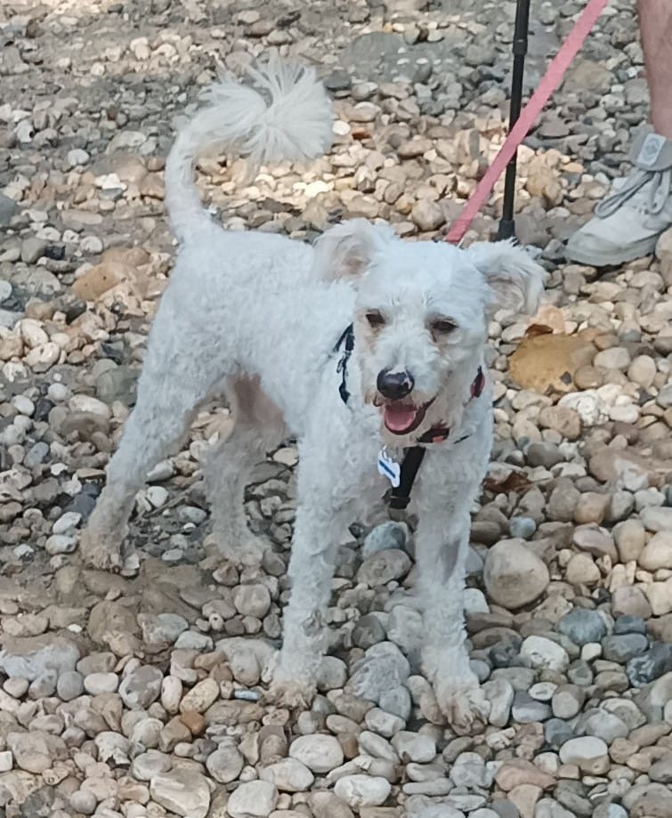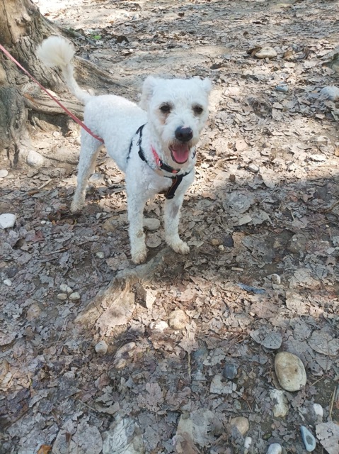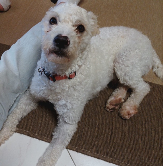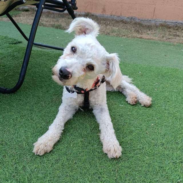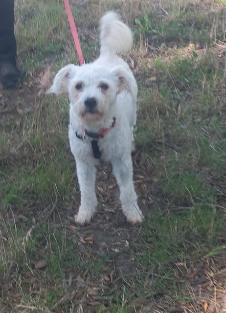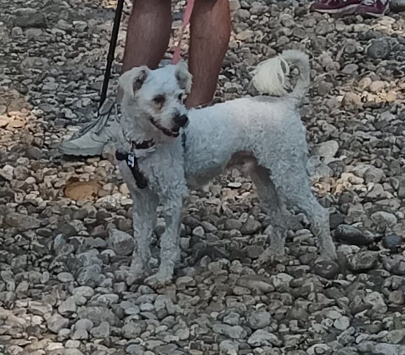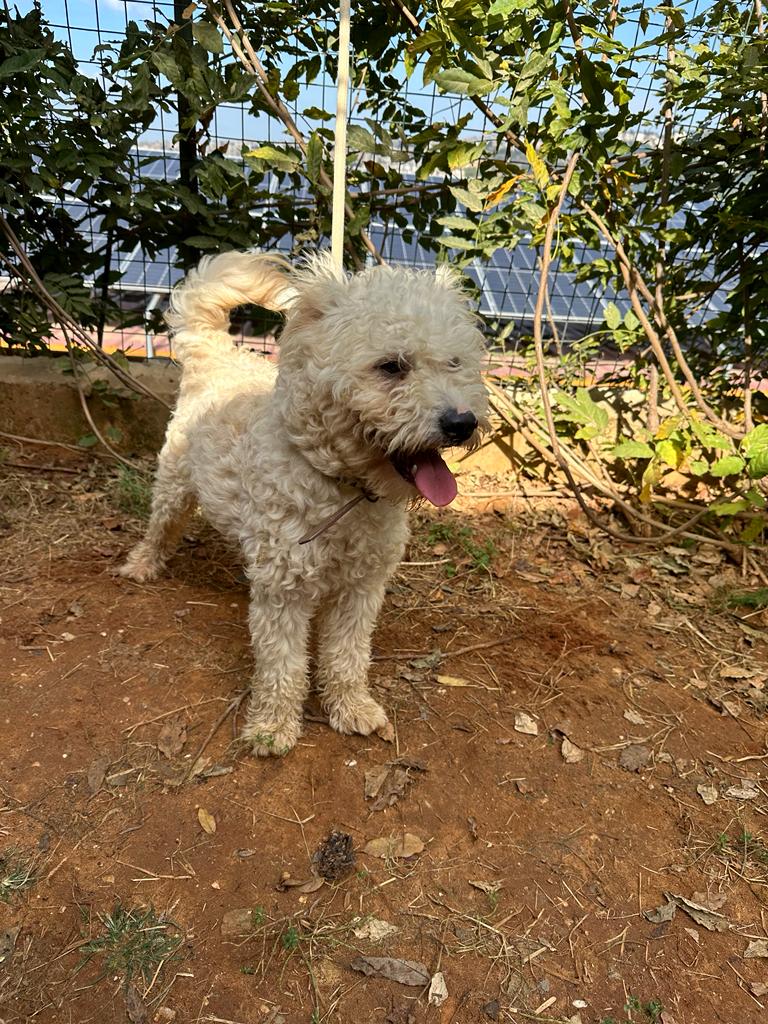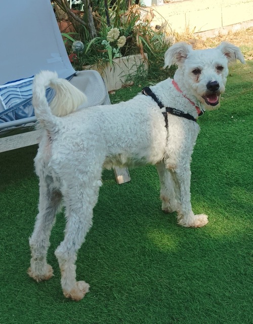 RITZ est un chien de type croisé bichon / caniche, non lof, couleur blanc au poil frisé.
