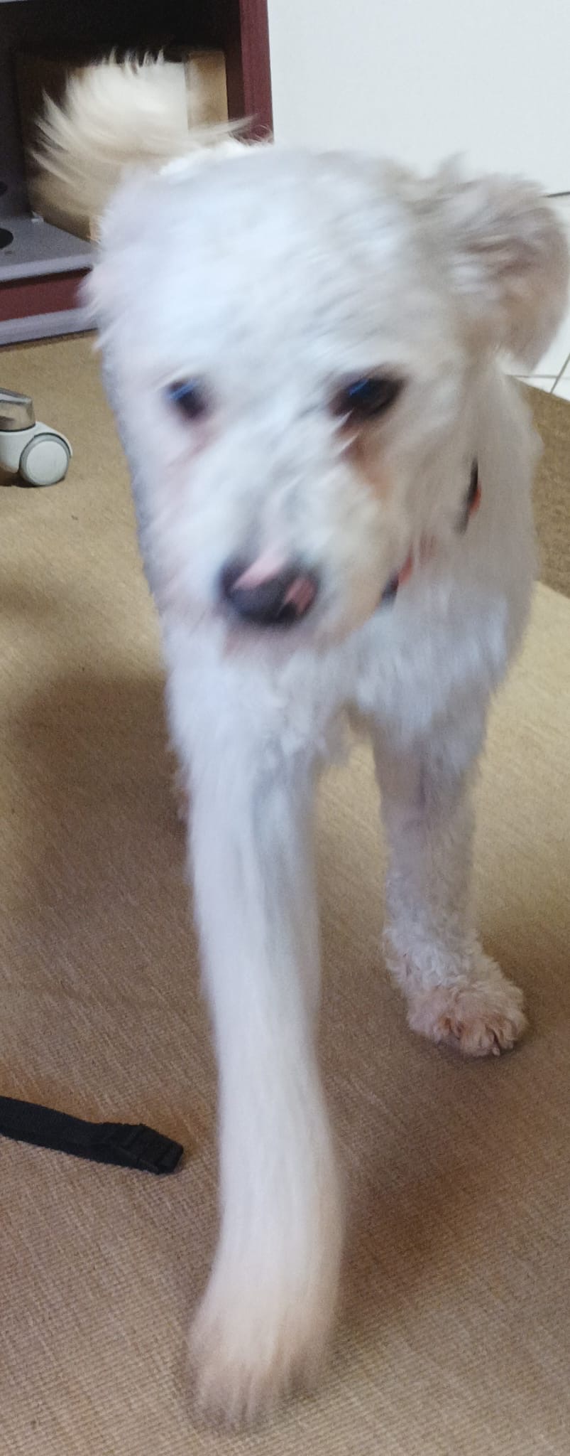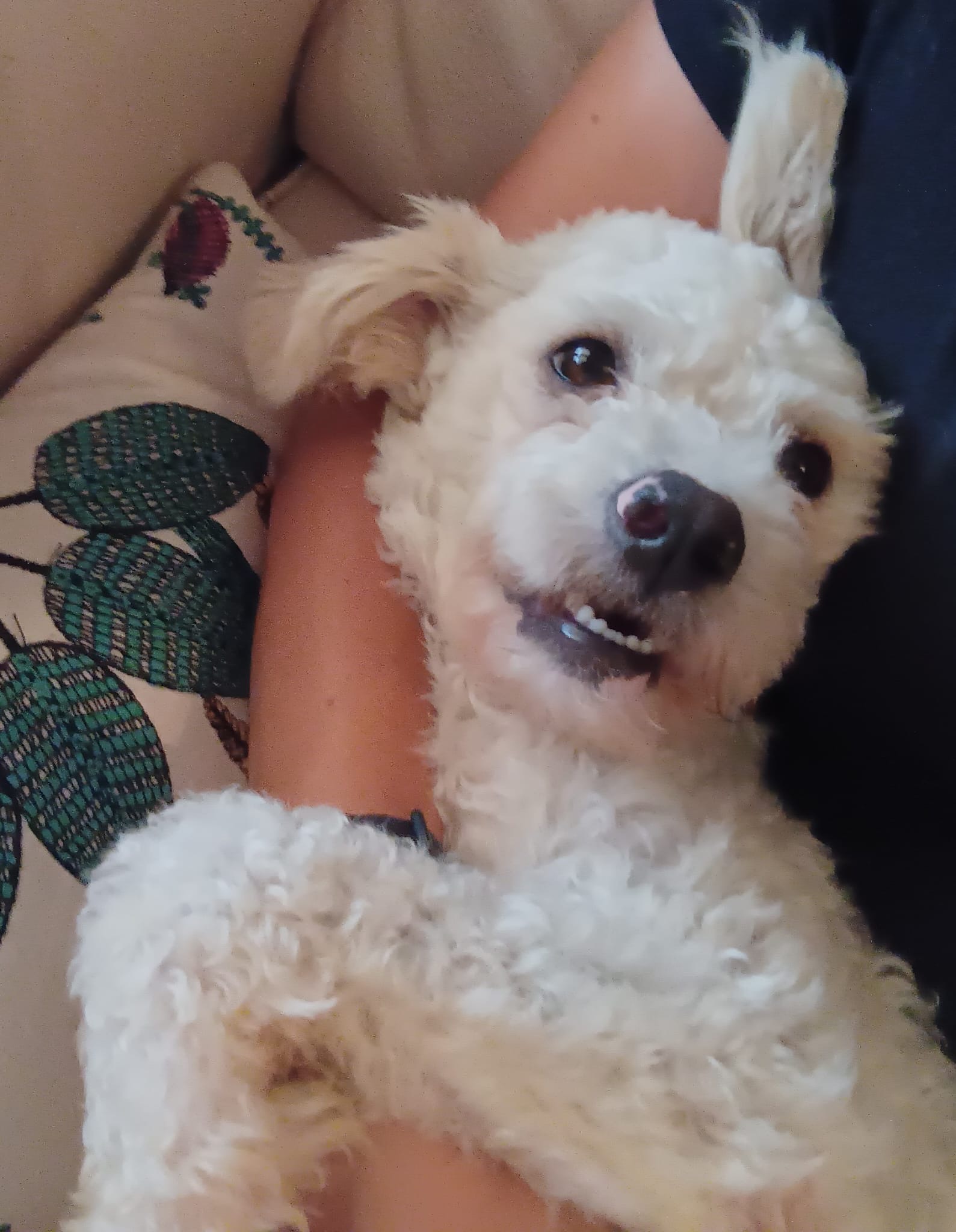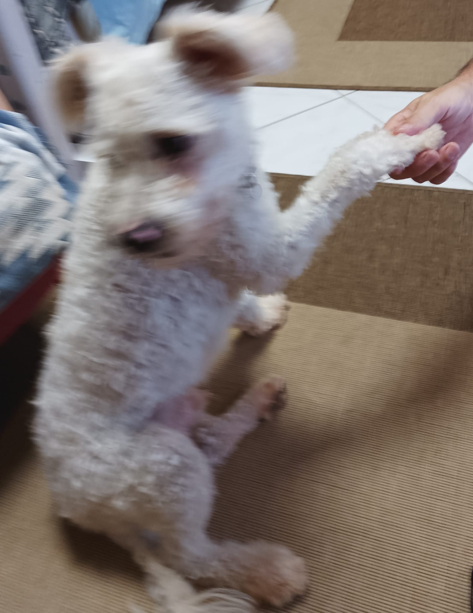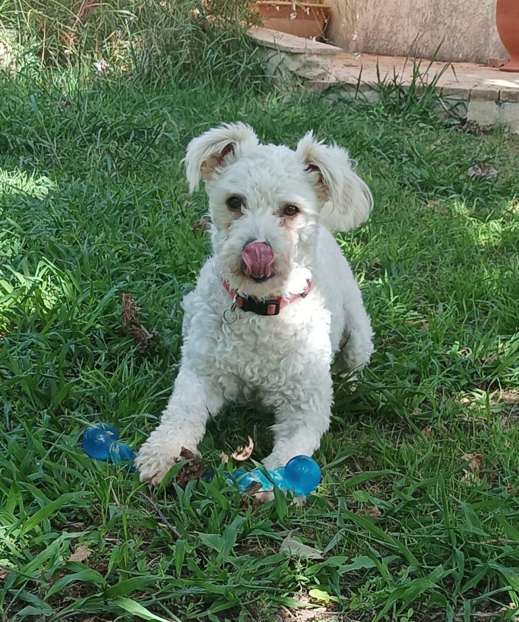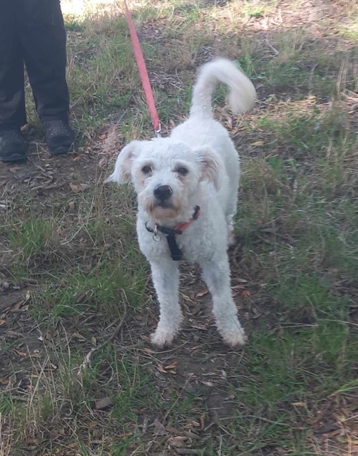 RITZ est un chien de type croisé bichon / caniche, non lof, couleur blanc au poil frisé.