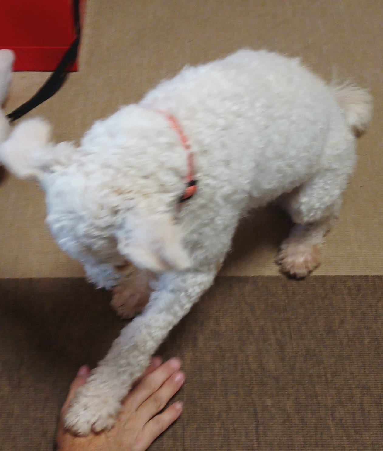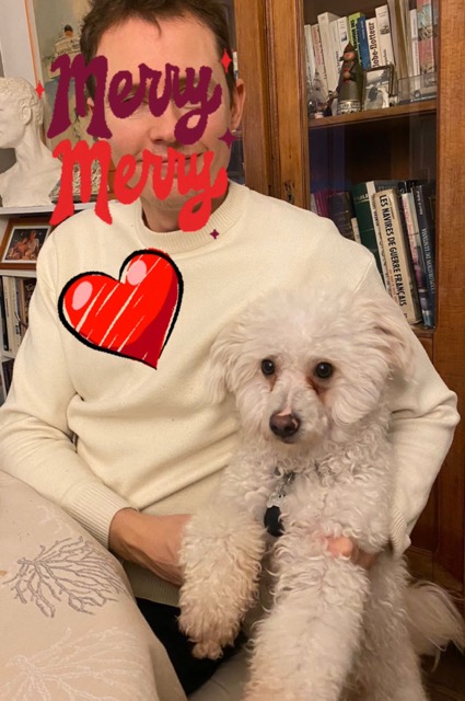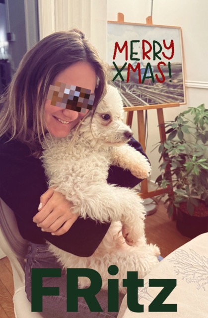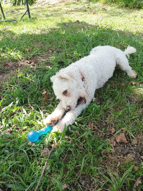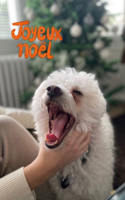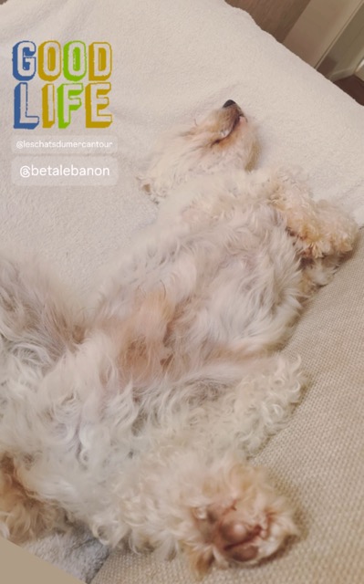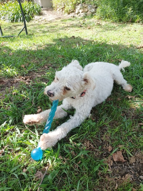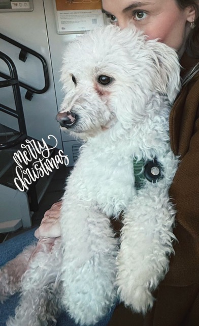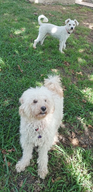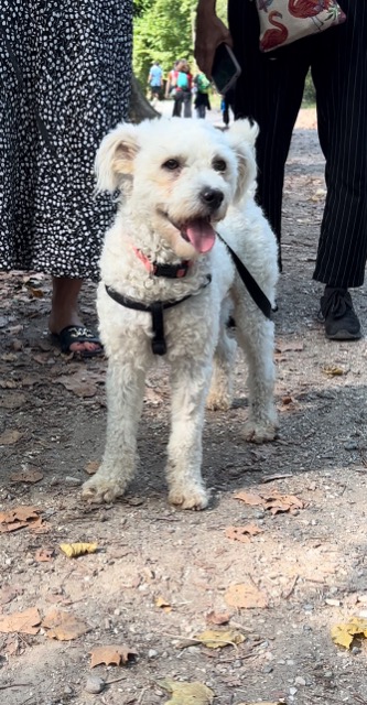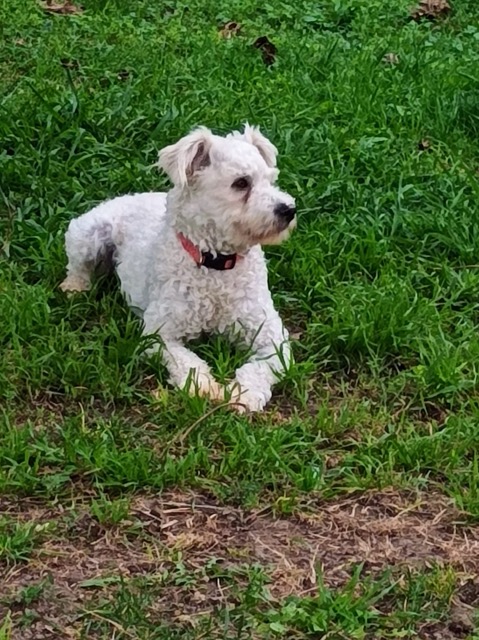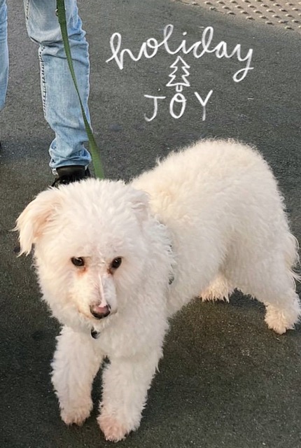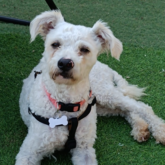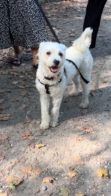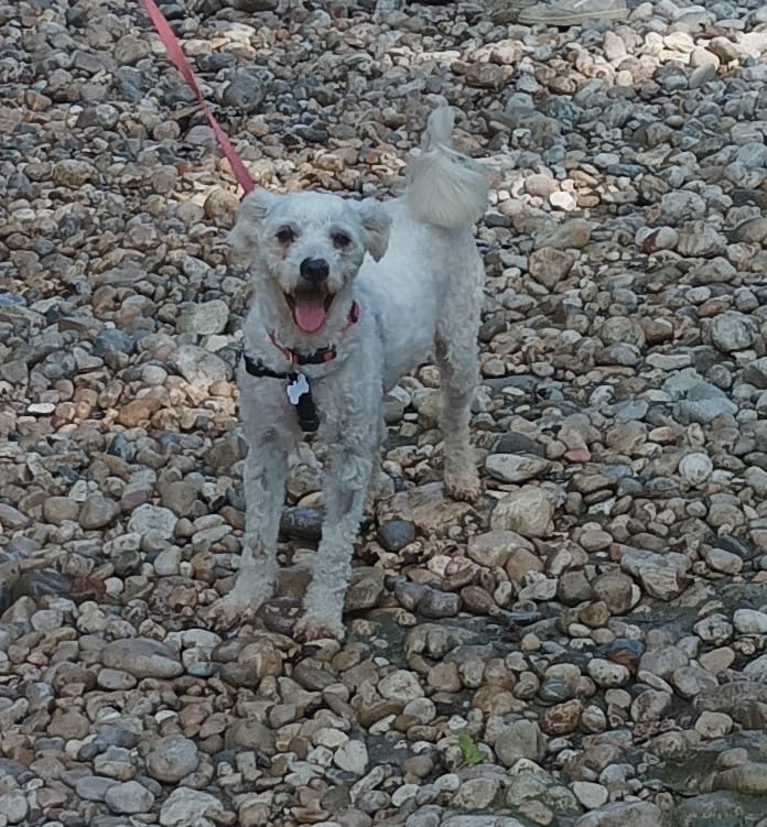RITZ est un chien de type croisé bichon / caniche, non lof, couleur blanc au poil frisé.