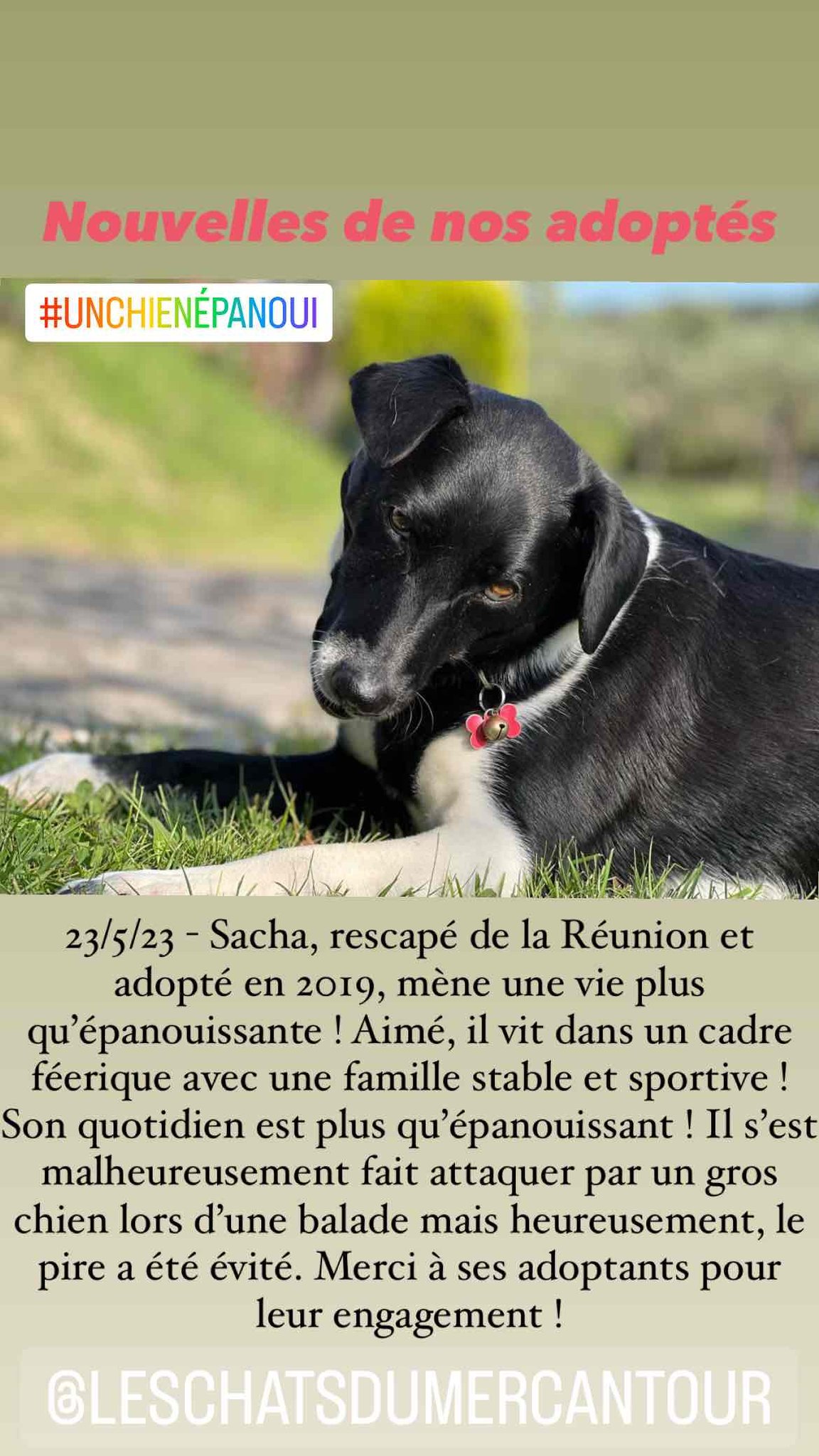 Jeté par dessus le portail d'une dame alors qu'il n'avait que quelques mois, à la Réunion, ce geste lui a couté cher dans le sens où il a eu mal aux cervicales pendant un petit moment. Heureusement notre super Sacha est jeune et costaud et tout est rentré dans l'ordre. Aujourd'hui il est en pleine forme, et attend sagement dans sa famille d'accueil, une famille pour la vie.
