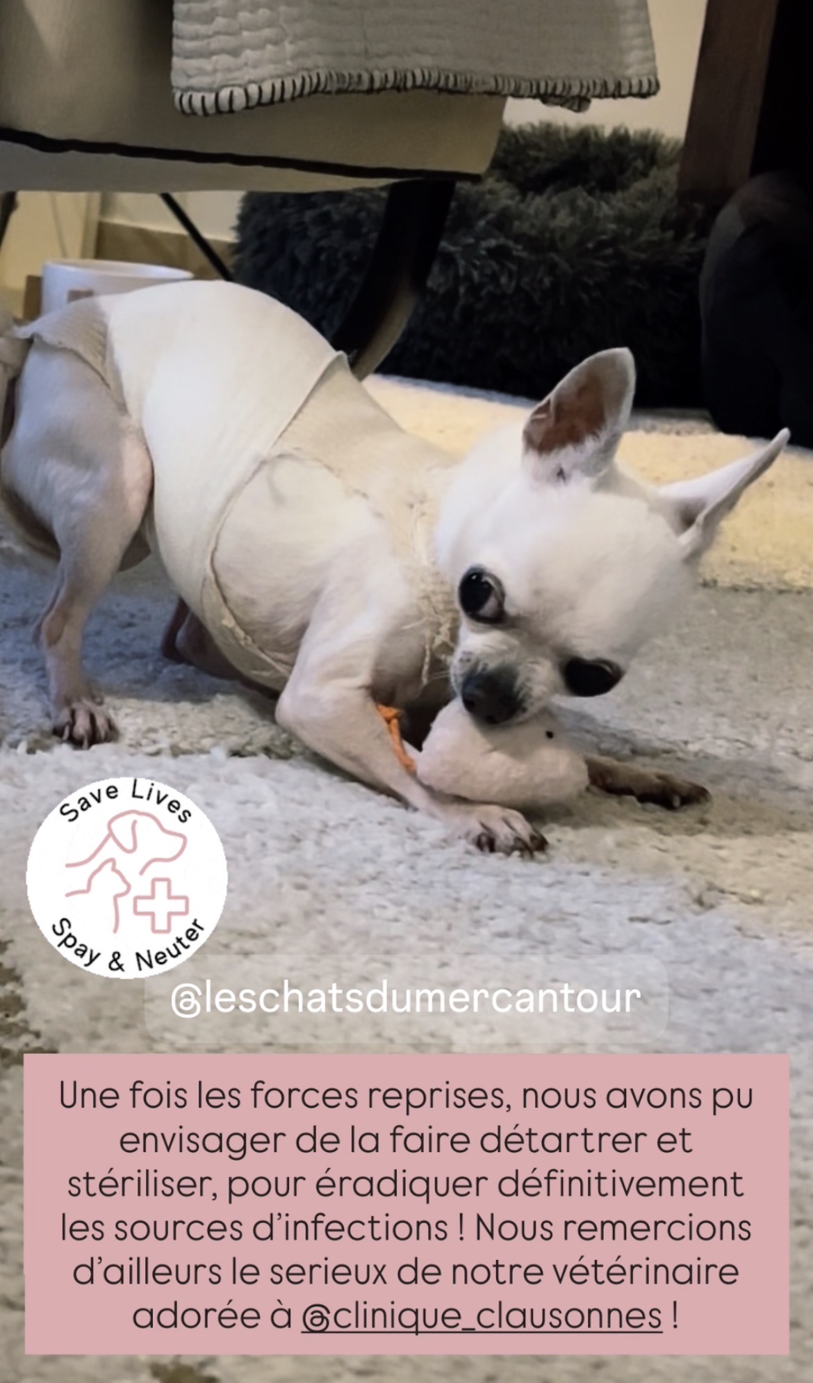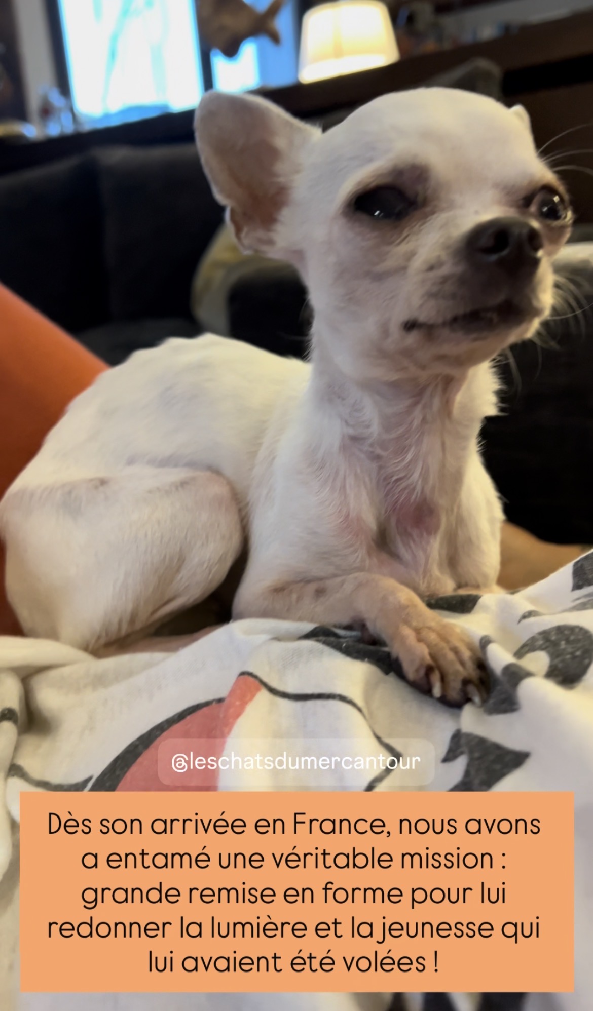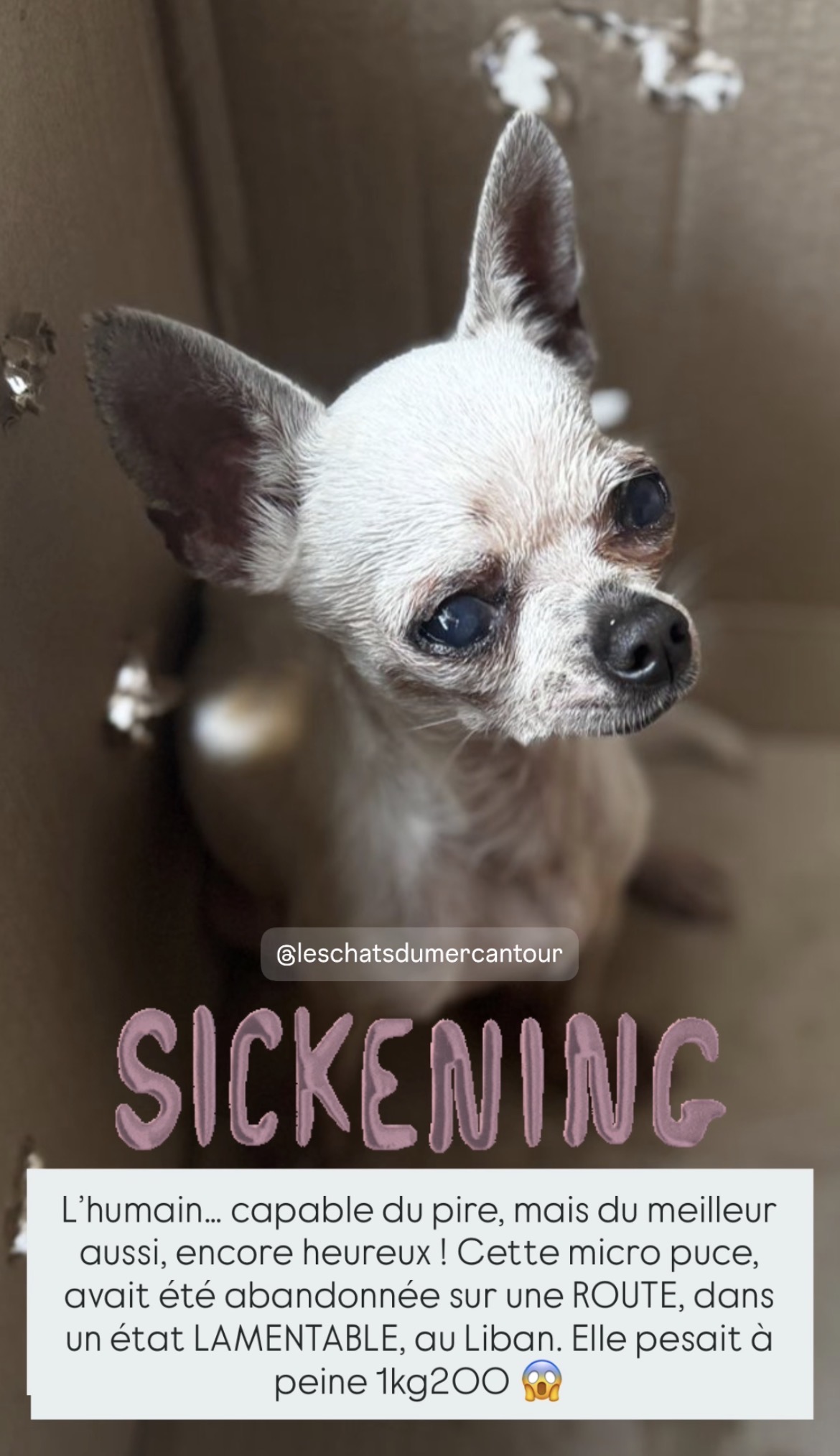 Sa date de naissance était initialement estimée au 10/10/2012 mais avec le temps on pense qu’elle a plutôt 7 ans et elle pèse 1,5kg.