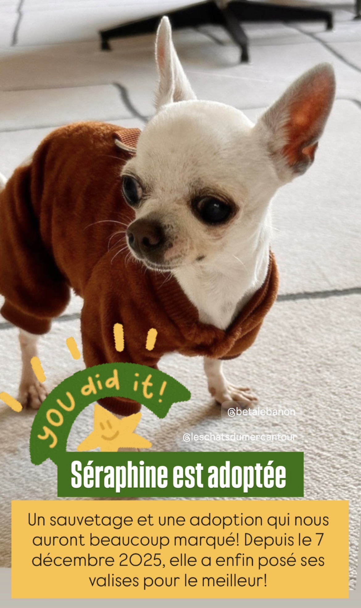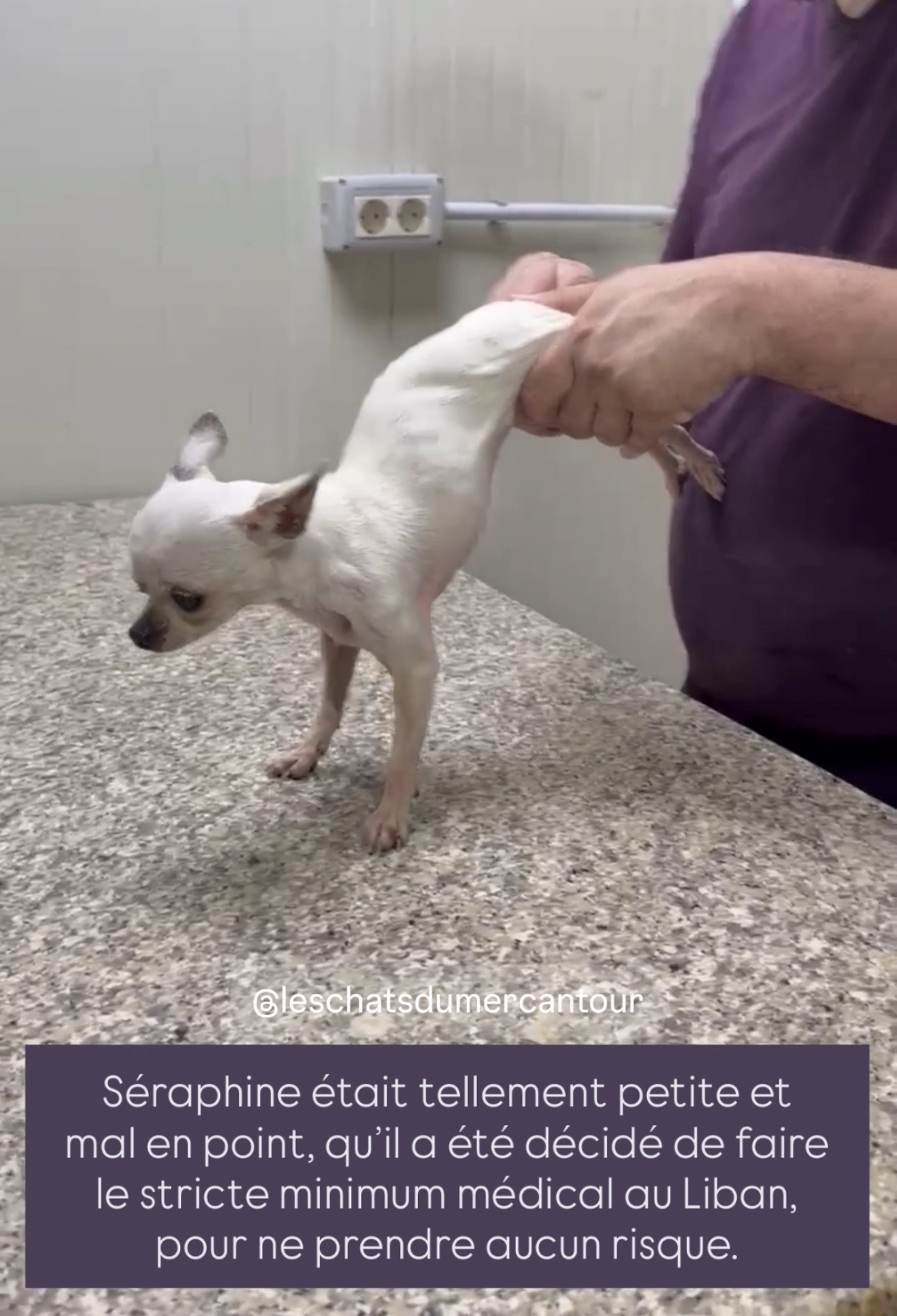 SERAPHINE a été trouvée abandonnée sur une route de montagne, au Liban. Elle était squelettique, paraissait aveugle et son état était très inquiétant. On soupçonne qu’elle ait passé une partie de sa vie dans une cage, en vue de son état et démarche.