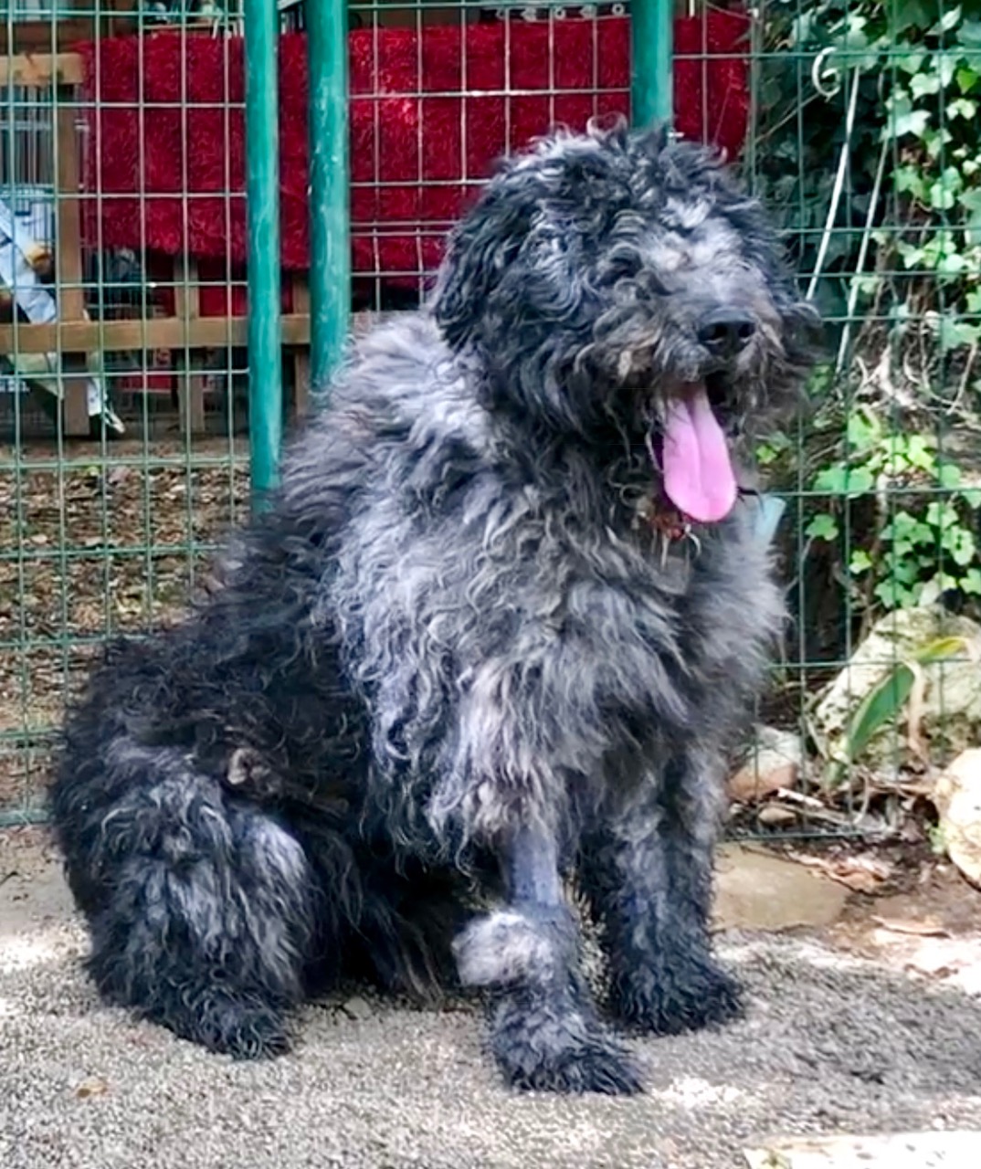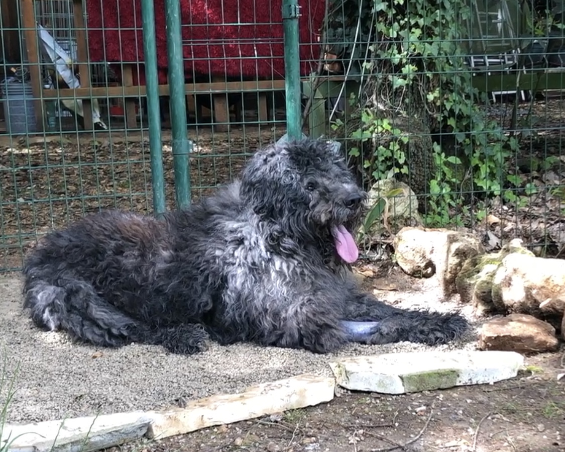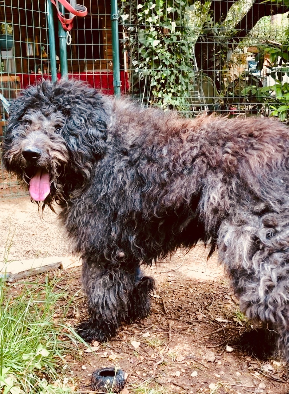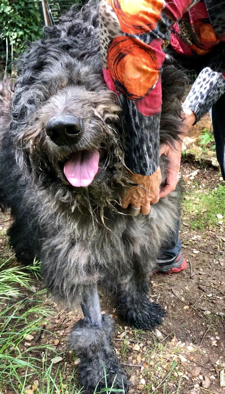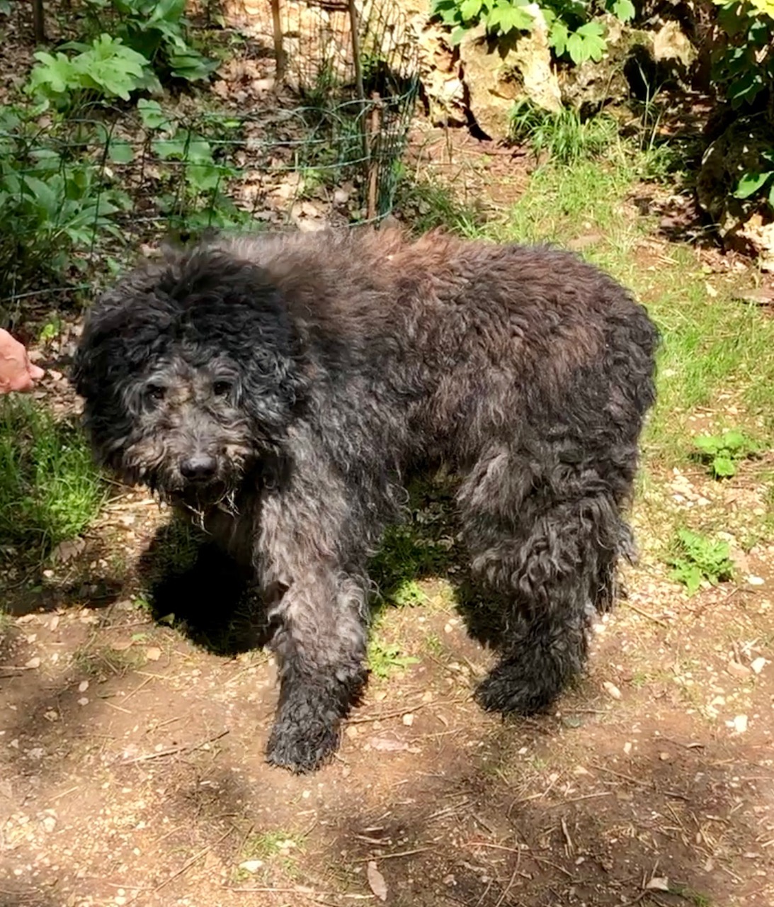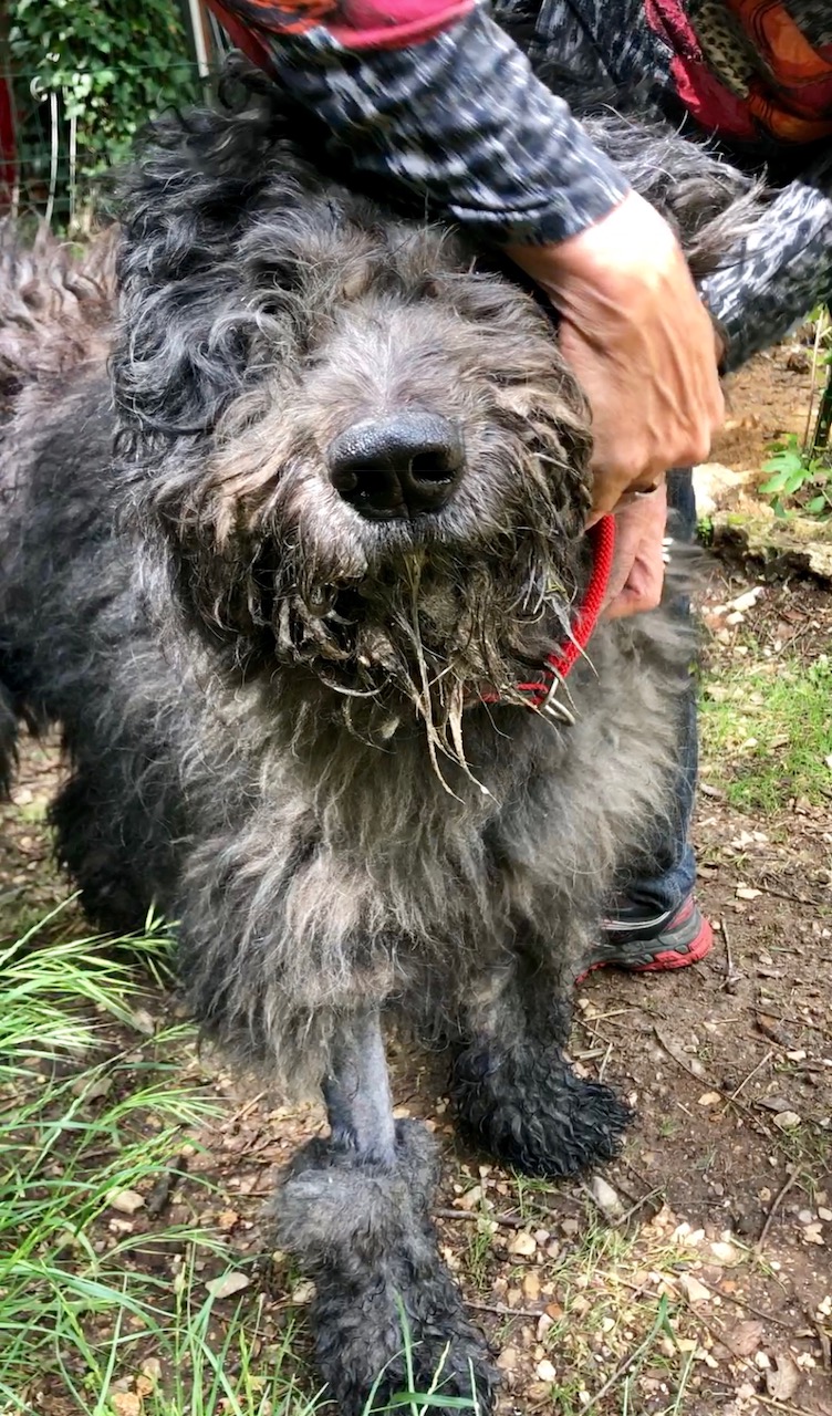Quoi qu’il en soit, il est arrivé à l’association dans un état PITOYABLE, que ce soit physiquement ou psychologiquement. Même le tondre a été une mission en elle même, et pour cette raison il faudra un moment pour que son poil reprenne pour le côté « esthétique » (ce qui n’est vraiment pas la priorité dans son cas, puisqu’il avait même des morceaux de grillage qui lui rentraient dans la peau sous sa « carapace » de poils).