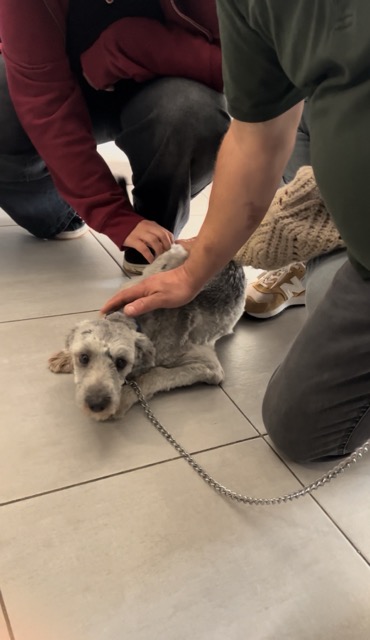 Au refuge, elle s’entend avec humains et tous les chiens (cependant, elle grogne sur les chiens quand elle est sur les genoux).