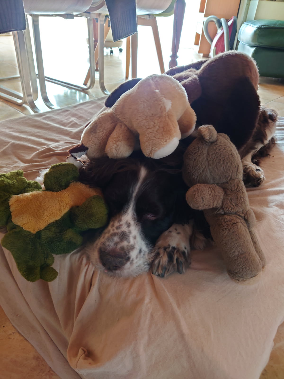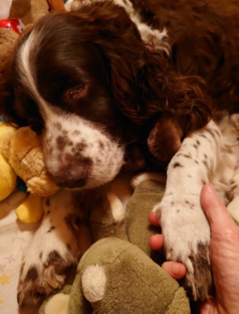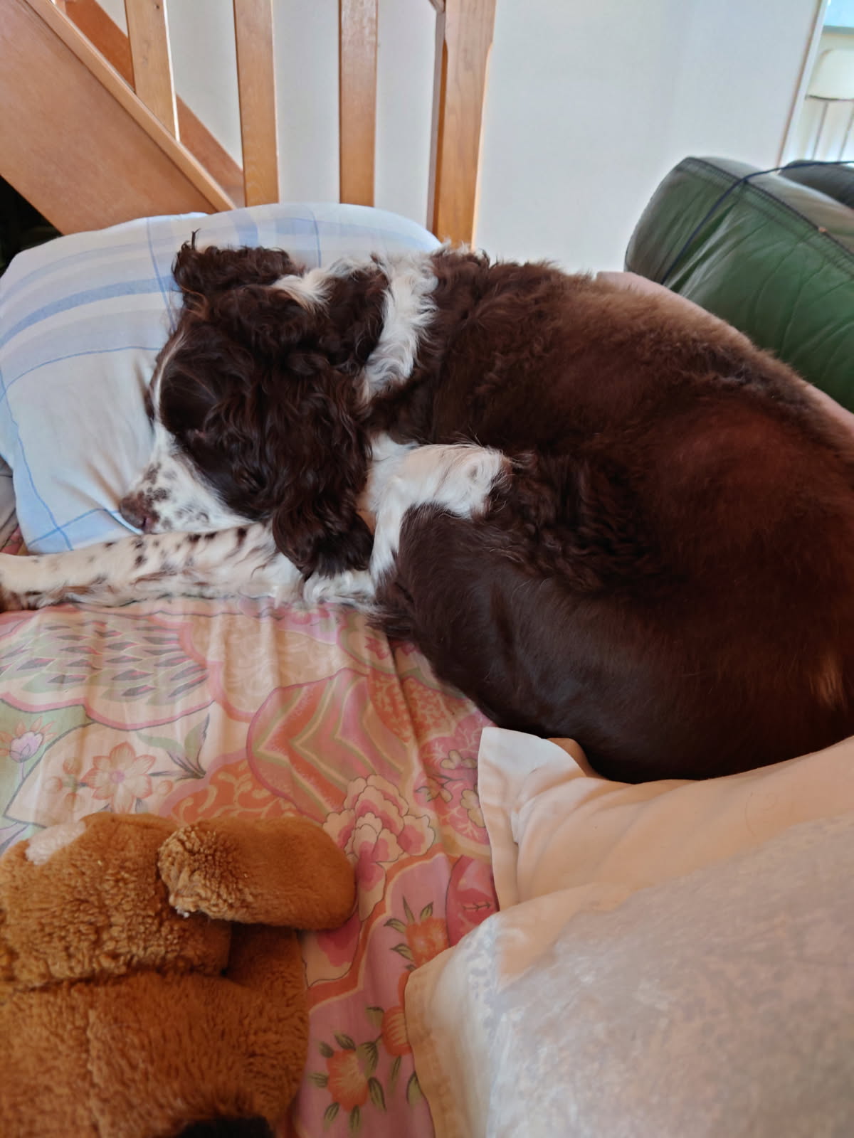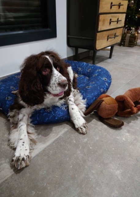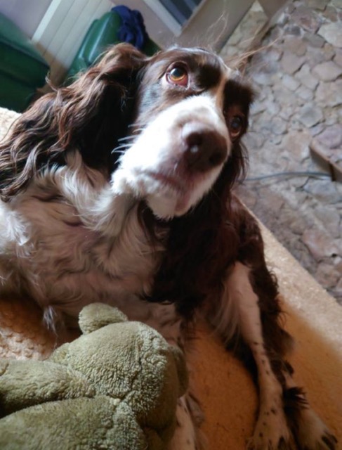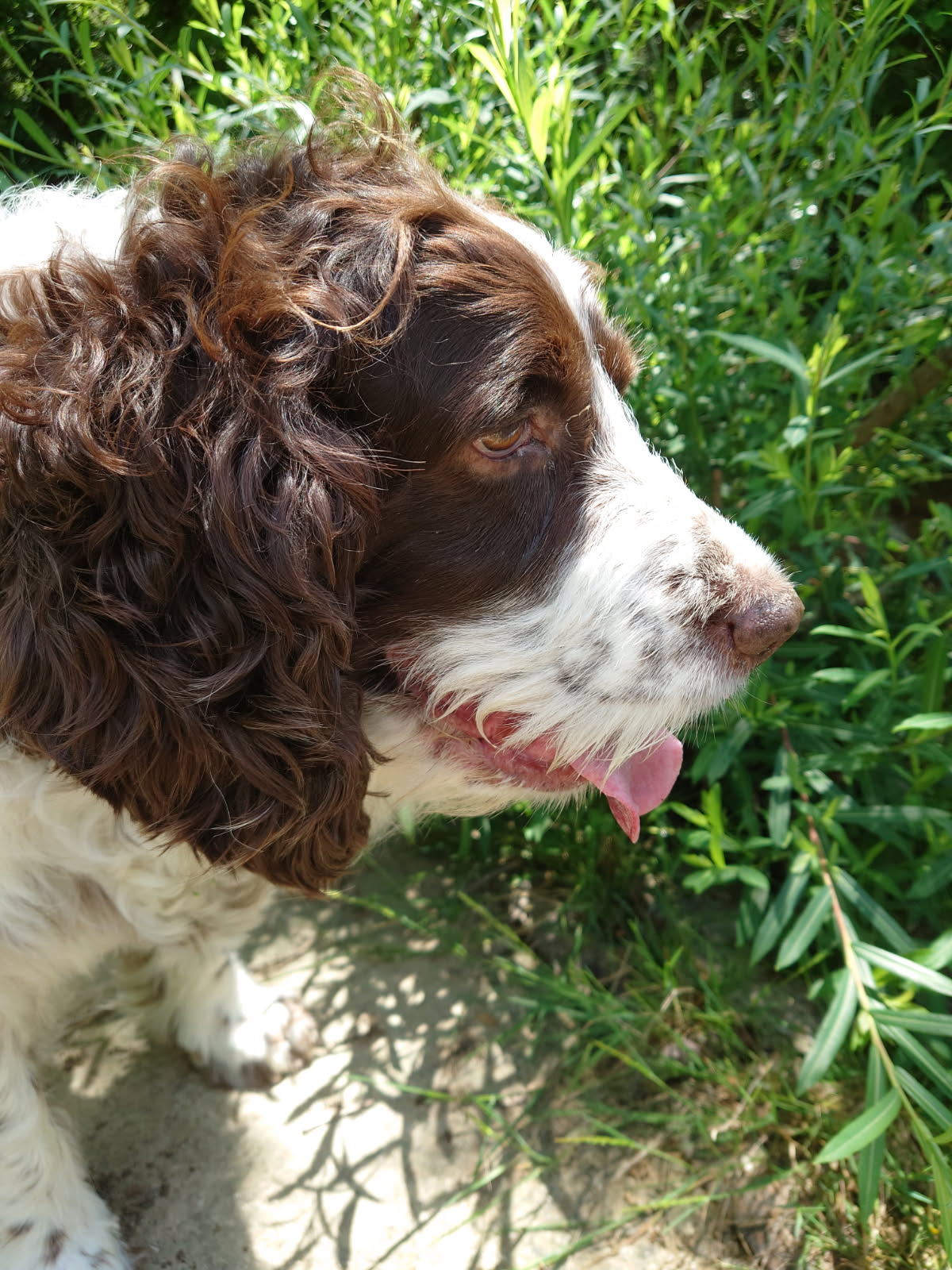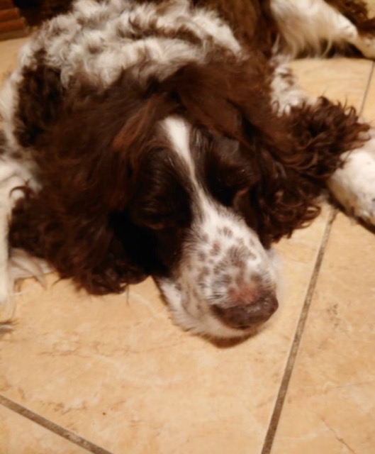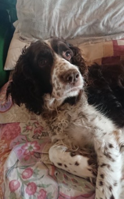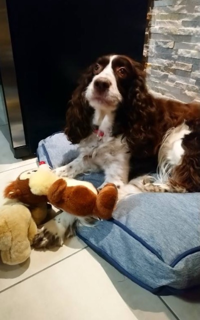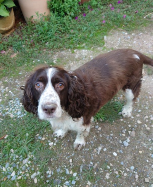 SNOOPYÂ est un chien de type Springer Spaniel, non lof, couleur foie et blanc.
