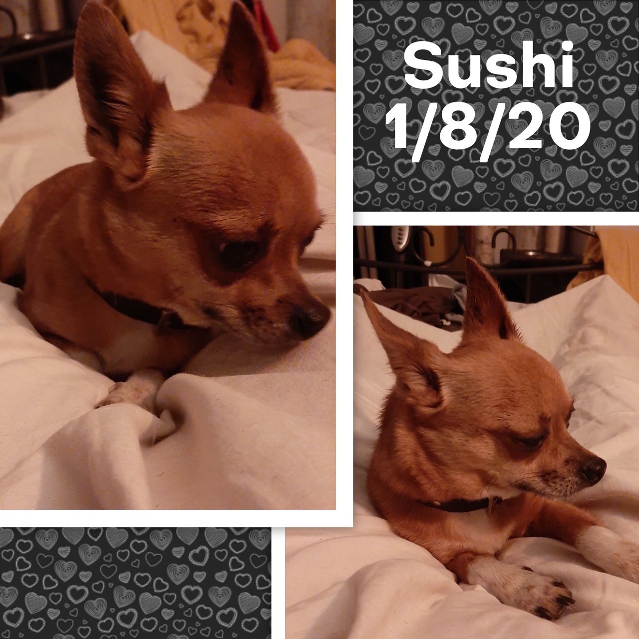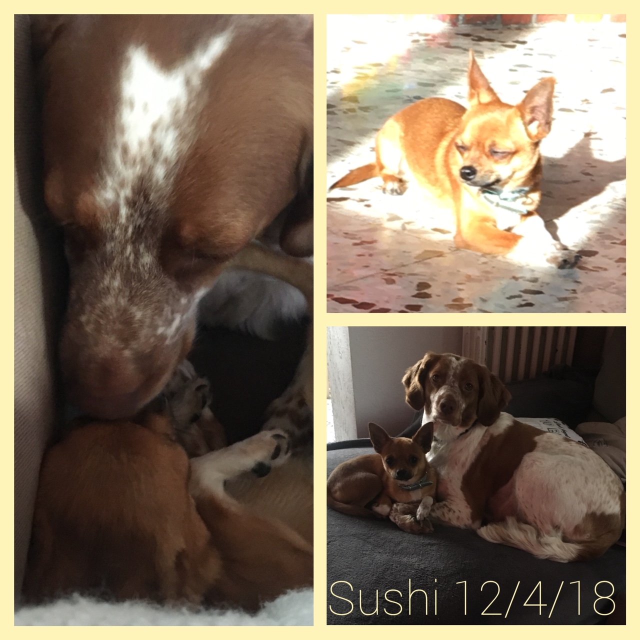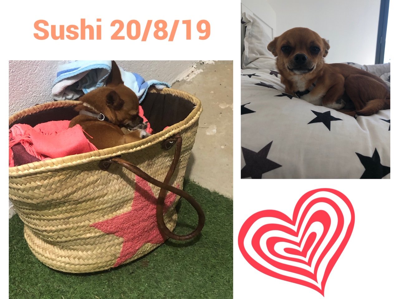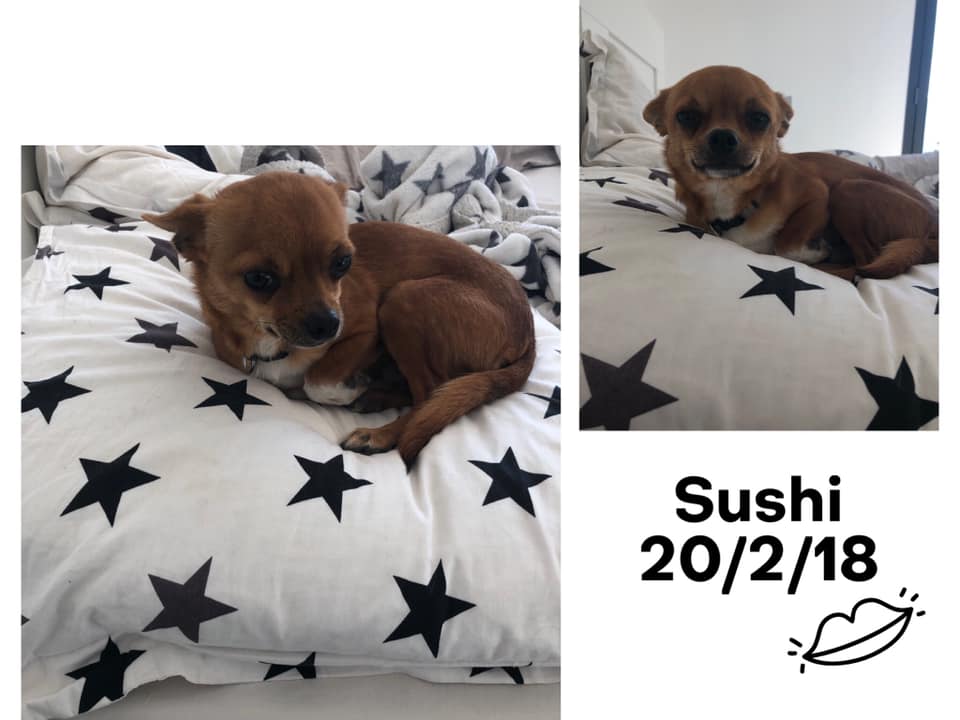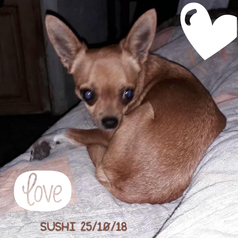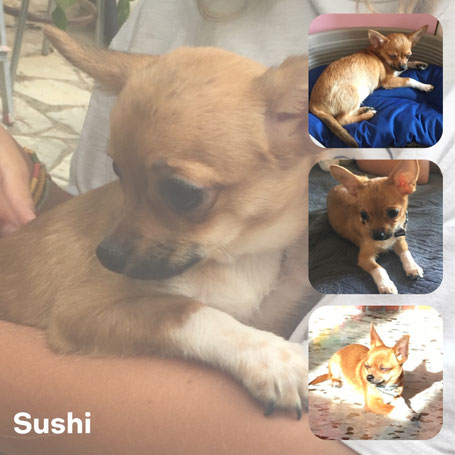 SUSHI est issu d’une portée voulue par un couple qui s’est laissé dépasser par le nombre de chihuahuas qui n’étaient pas stérilisés, et ils se sont retrouvés avec une quinzaine de chiens. Leurs tentatives de placer eux-mêmes les divers chiots chez des familles via internet se sont trop souvent avérées être de mauvais placements.