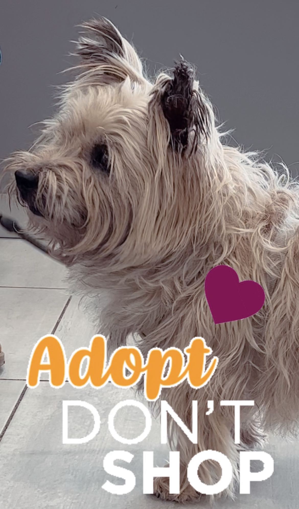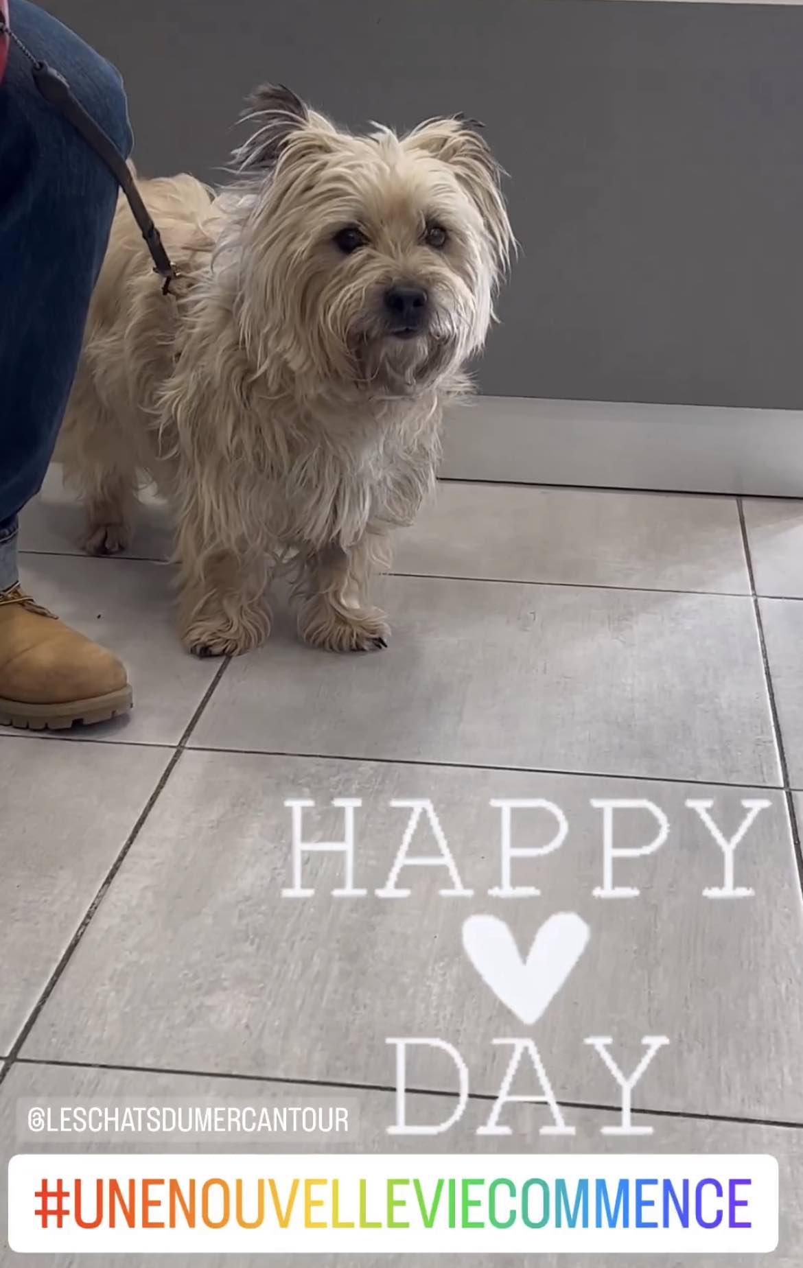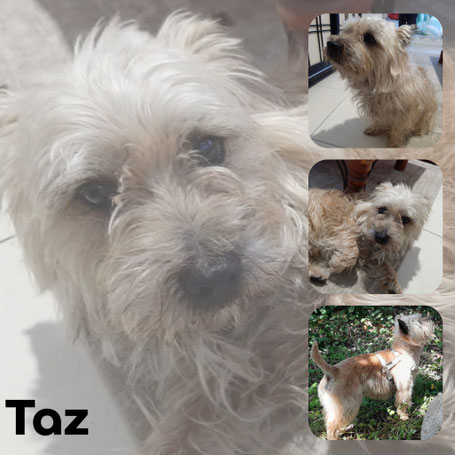 TAZ est un chien de race Cairn Terrier, non lof, couleur beige.