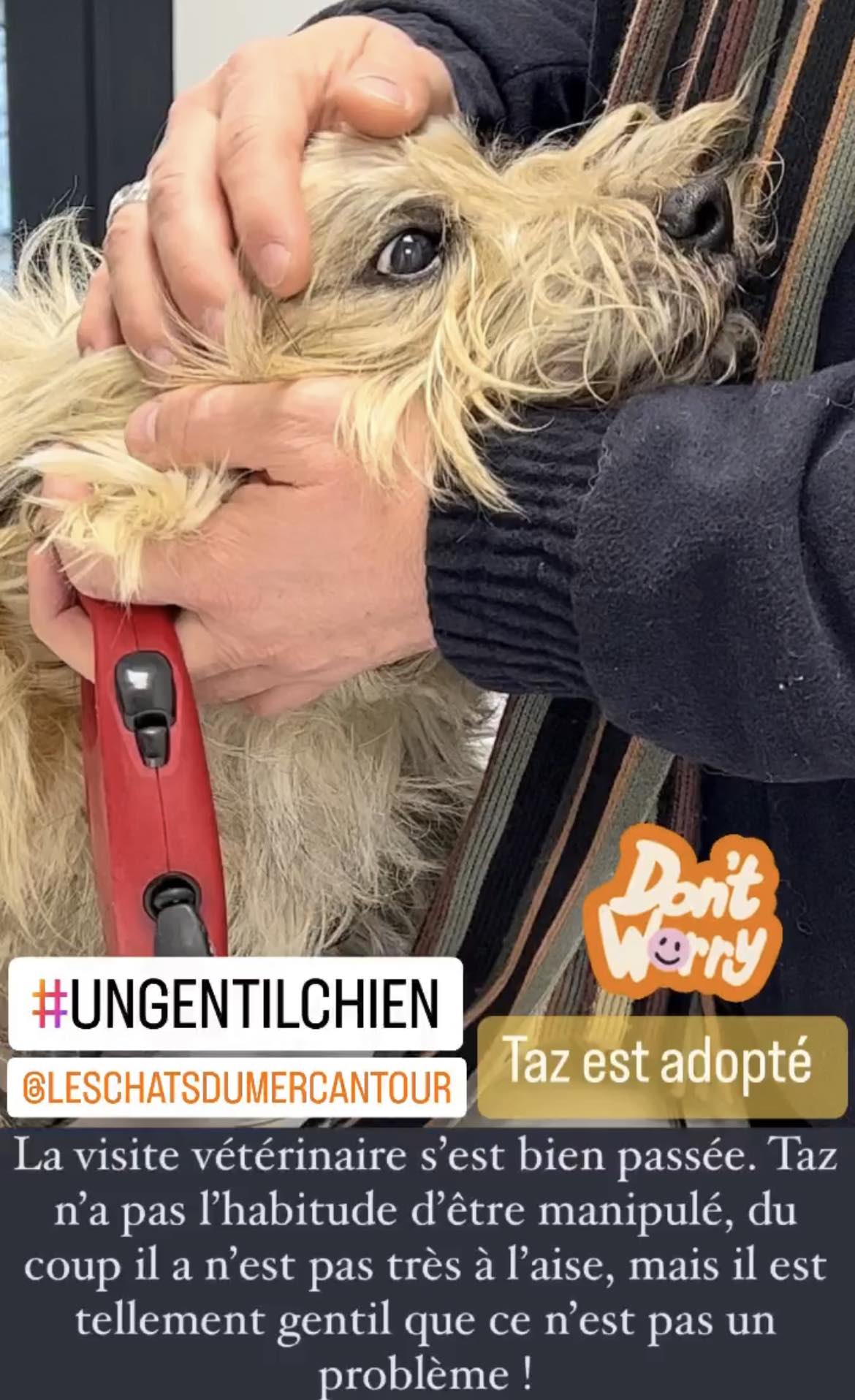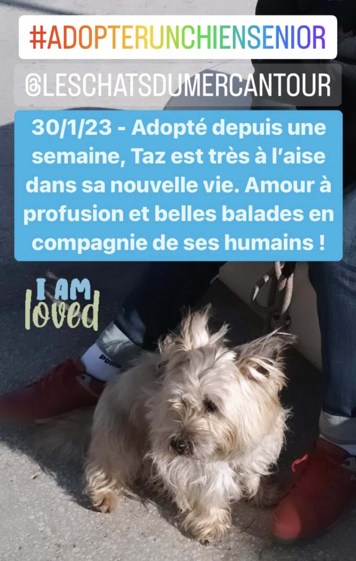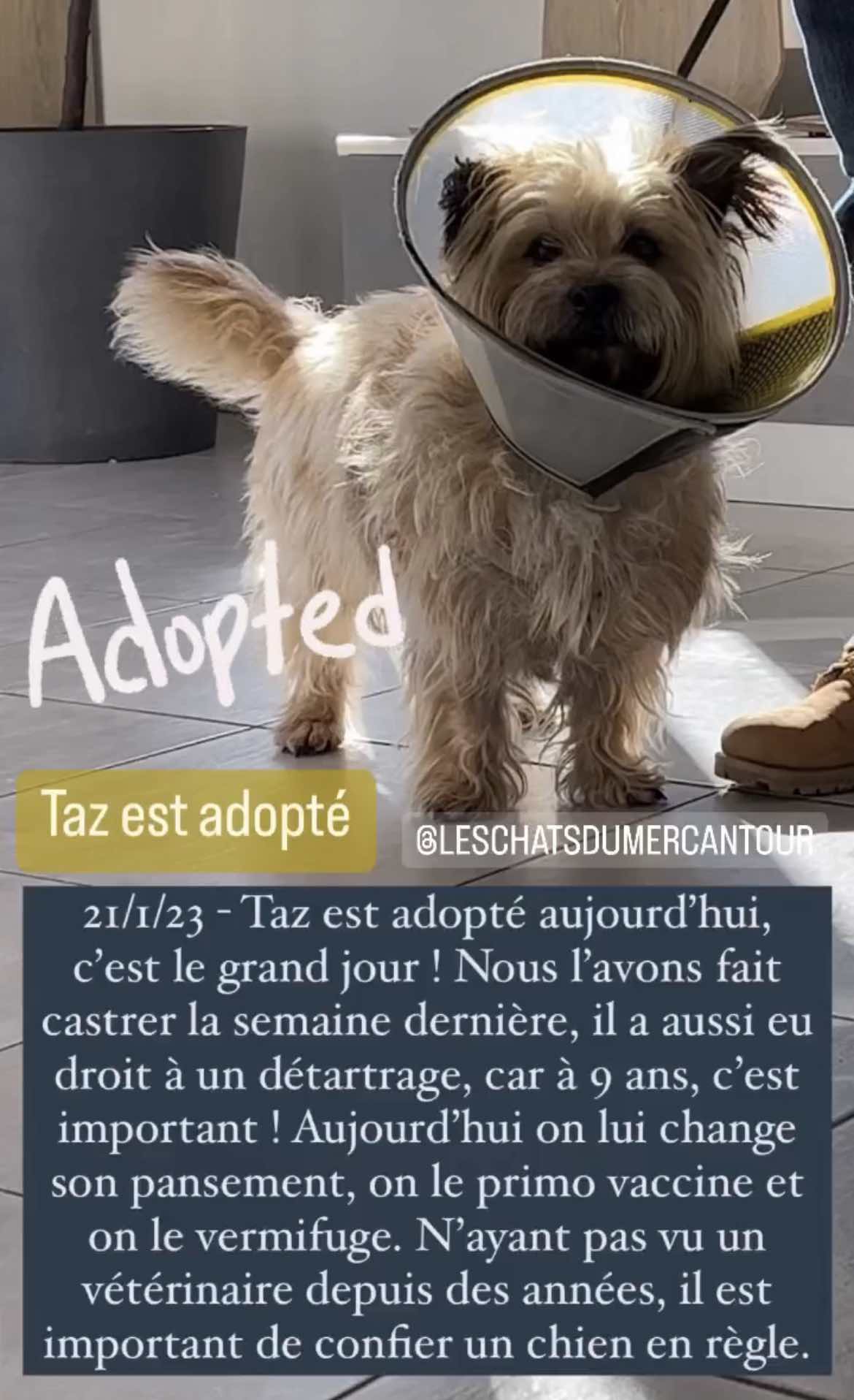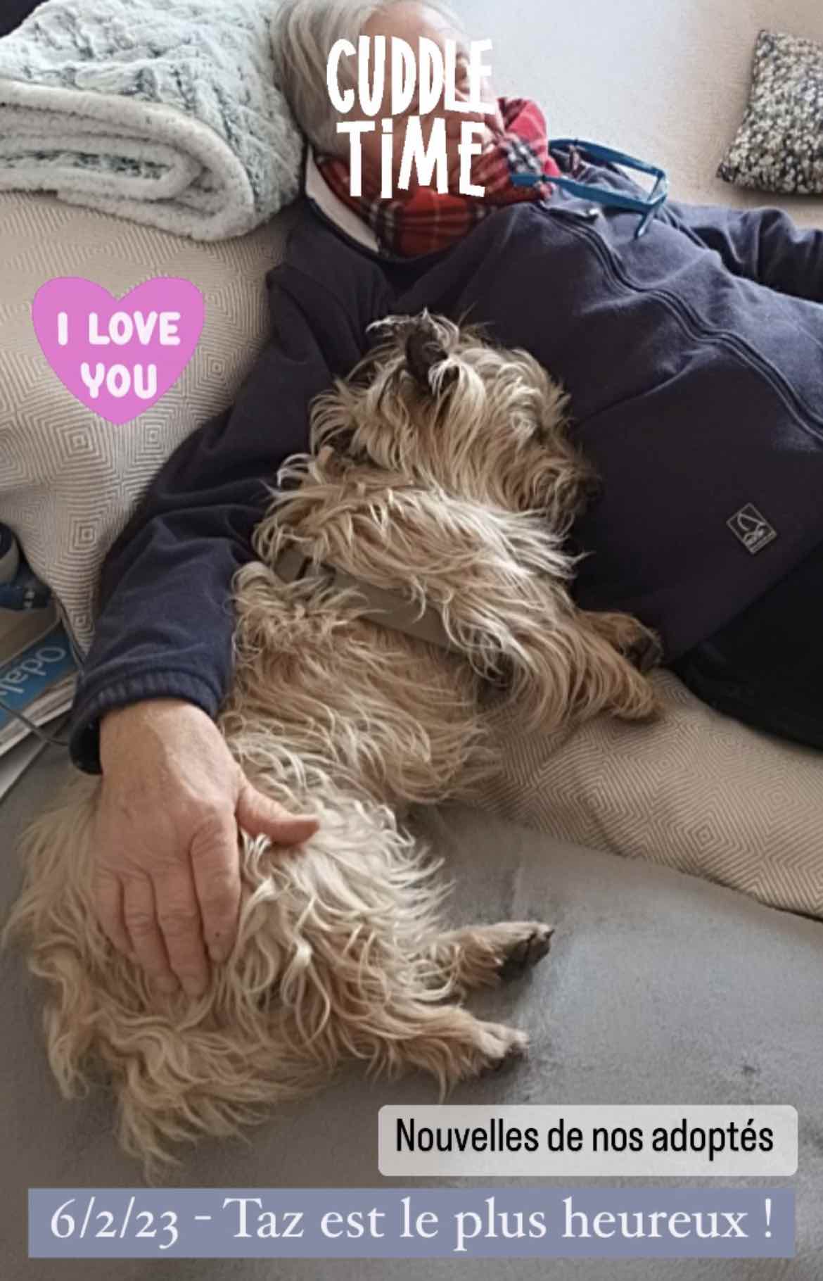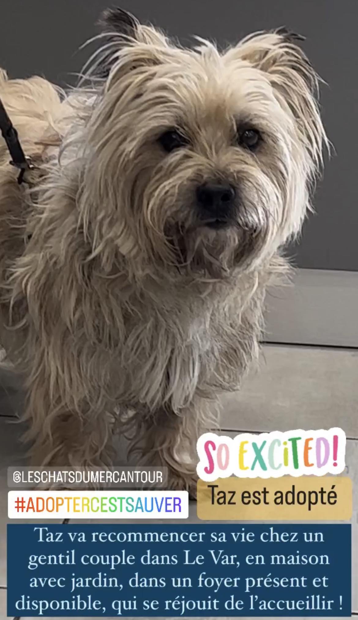 Malheureusement, suite à la séparation du couple et du changement de vie qui s’en suit, Taz est proposé à l’adoption. Il aboie quand il est seul car il ne supporte pas les longues heures de solitude et cela crée des problèmes de voisinage.