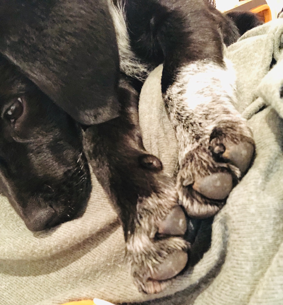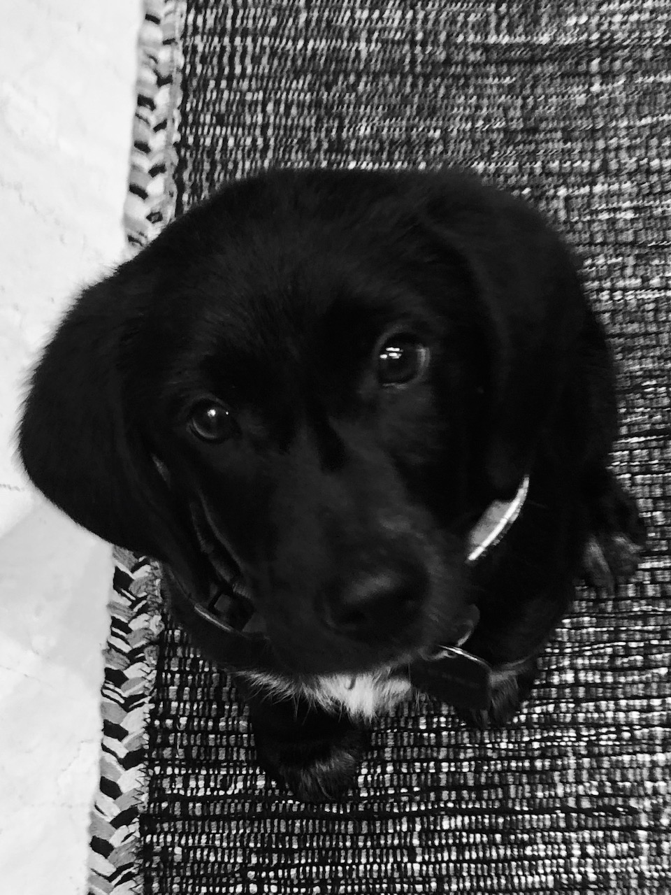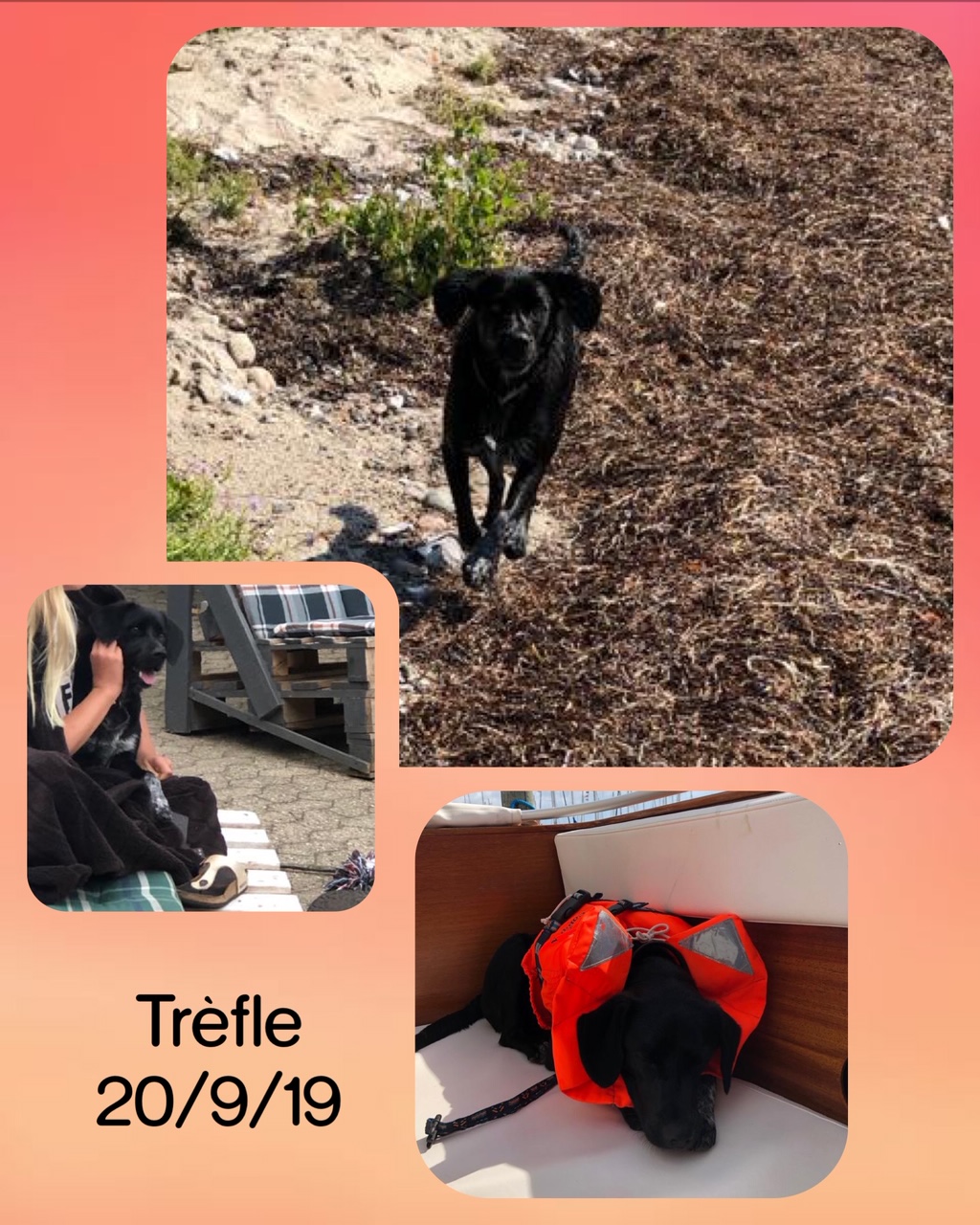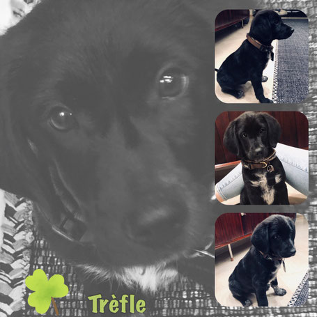 TREFLE est un chiot de type croisé Labrador et Epagneul, non lof, noir et blanc moucheté. Mâle vacciné, traité pour parasites internes et externes.