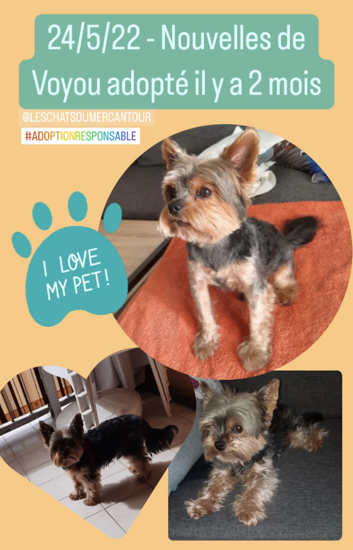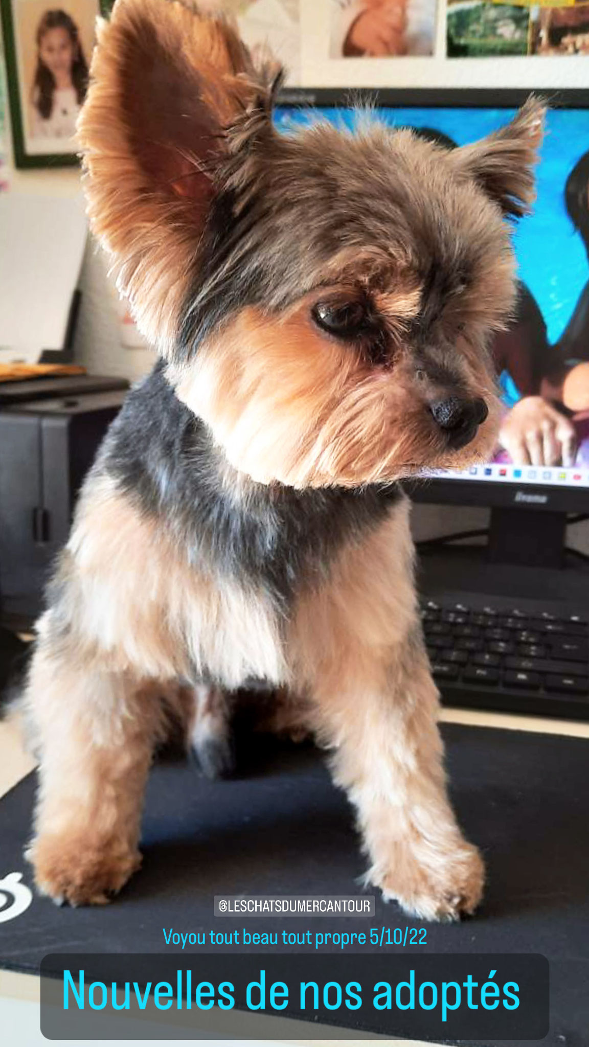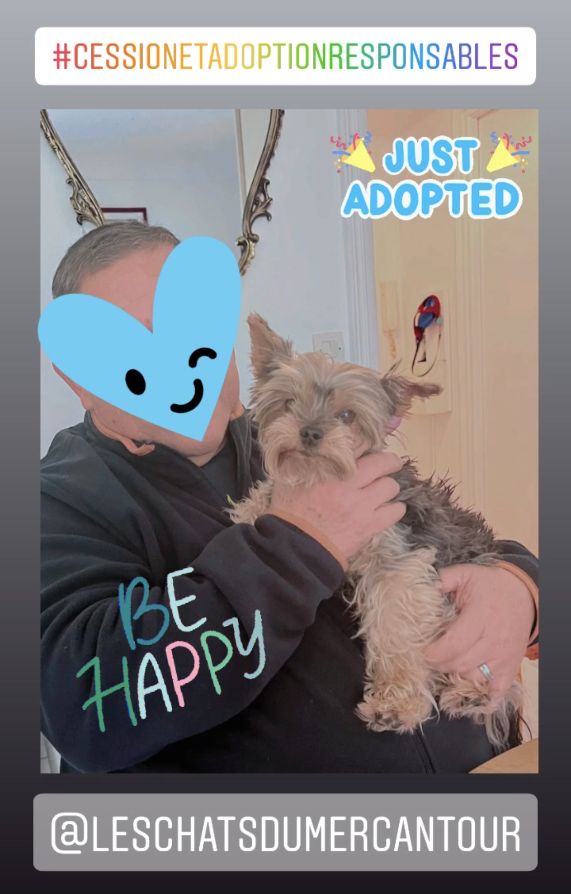 Suite à un changement de vie et en vue du fait qu’il course les chats, sa propriétaire a décidé de le mettre à l’adoption, pour qu’il puisse trouver un foyer pouvant lui offrir un cadre de vie serein.